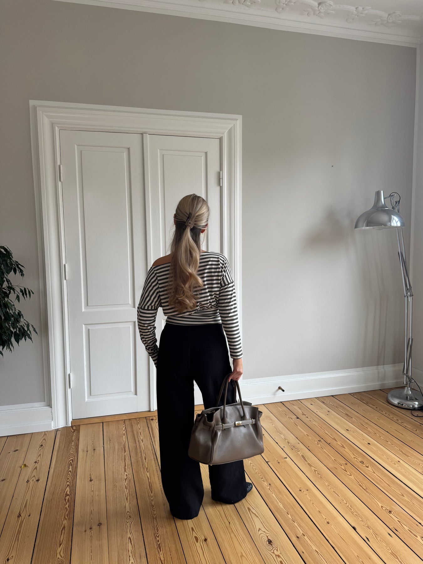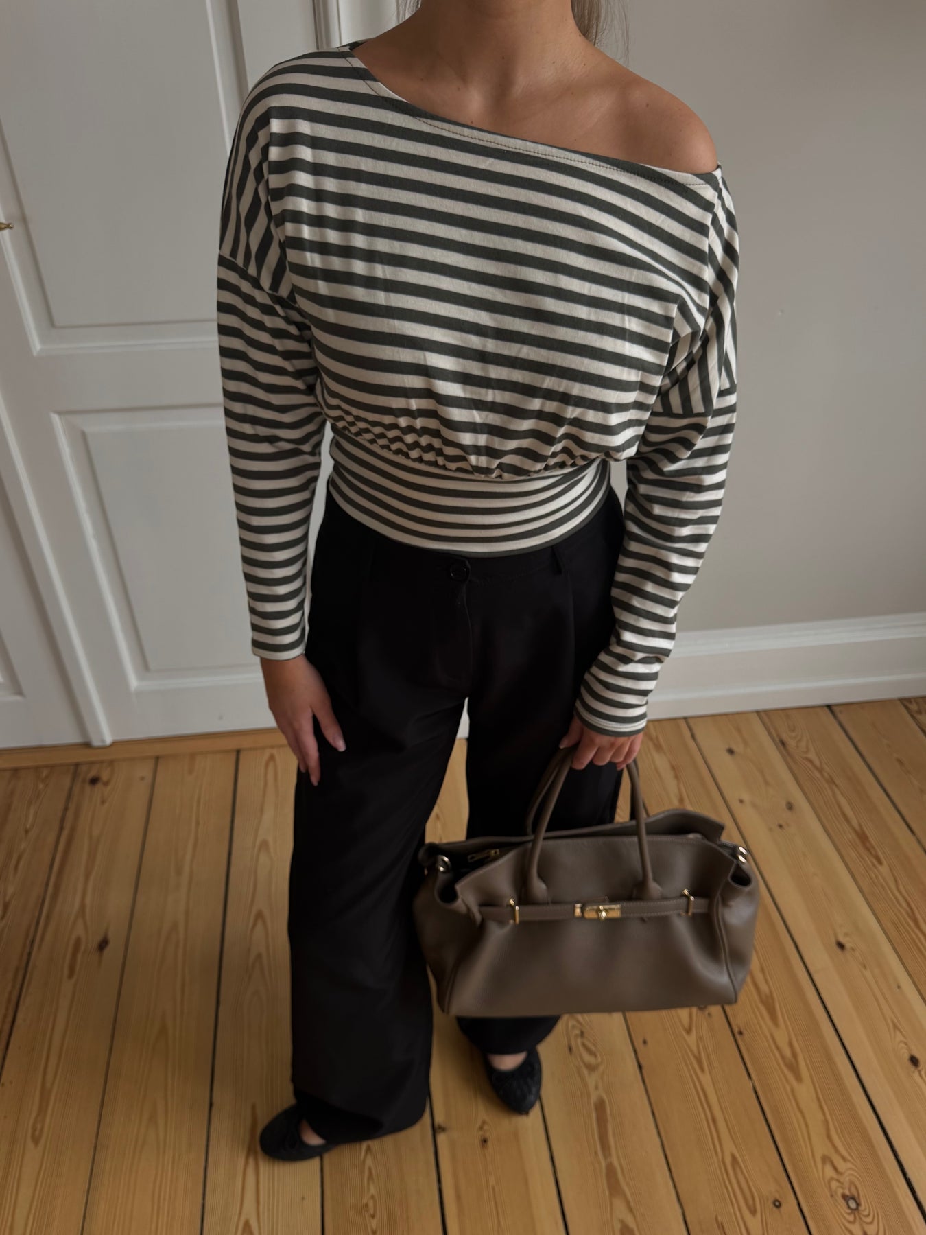 Michelle is a feminine and modern top with a relaxed but eye-catching look. The asymmetrical cut and fine stripes create an exciting play in the design, while the defined waist accentuates the figure in a flattering way.