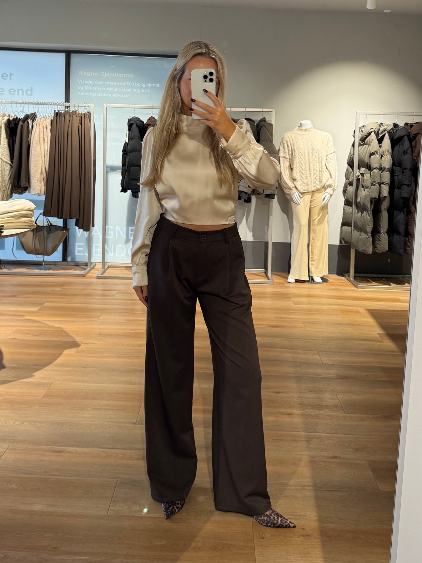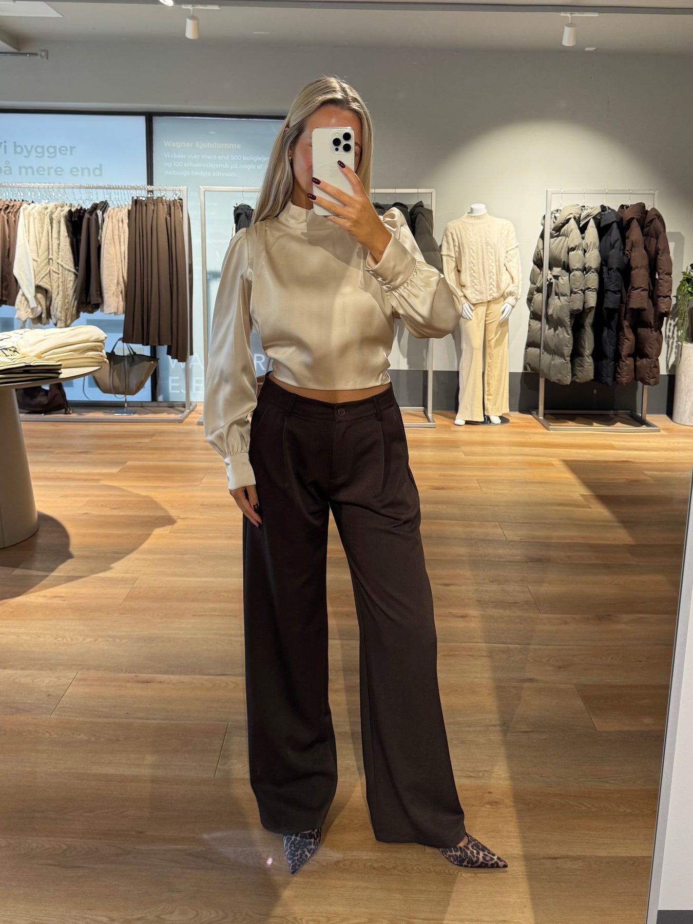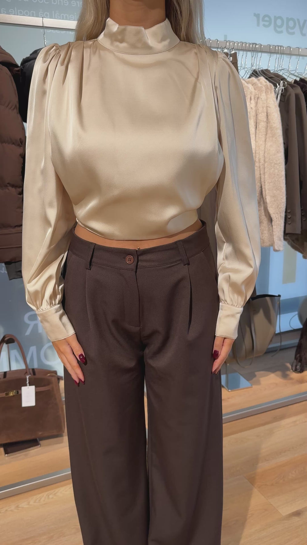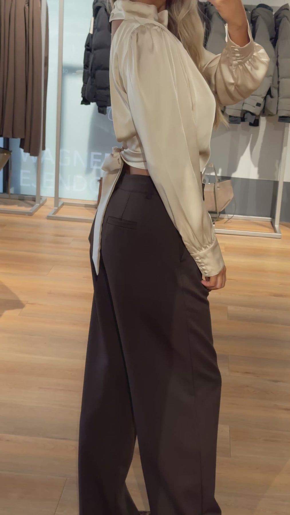 Ana blusen har en åben ryg og lukkes i nakken. Den har knapper på ærmerne som har en ballon form og går ind omkring håndleddet.