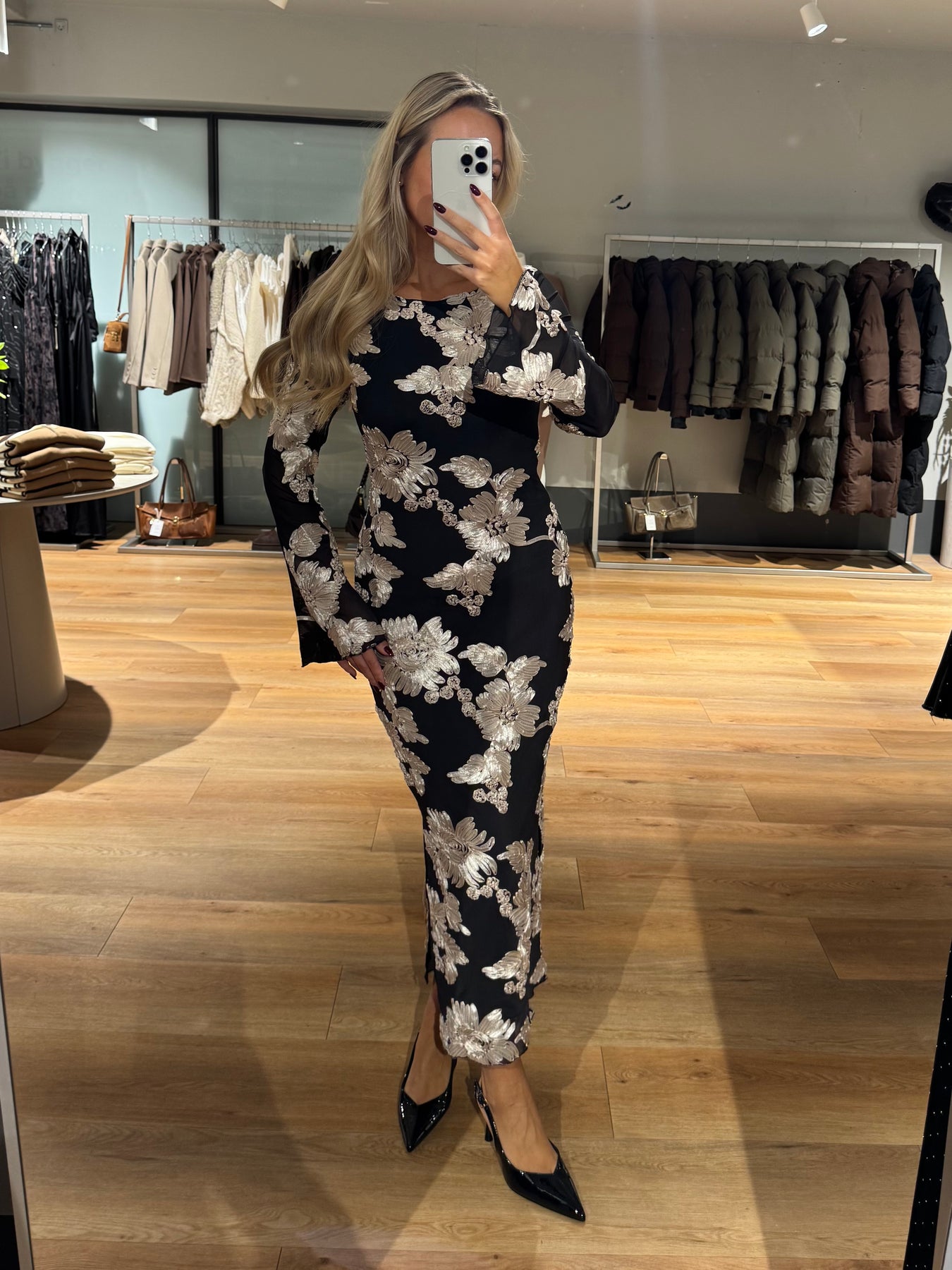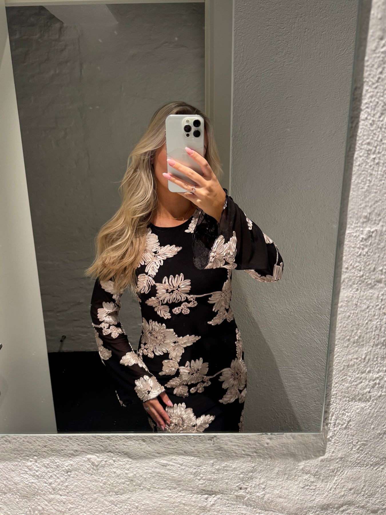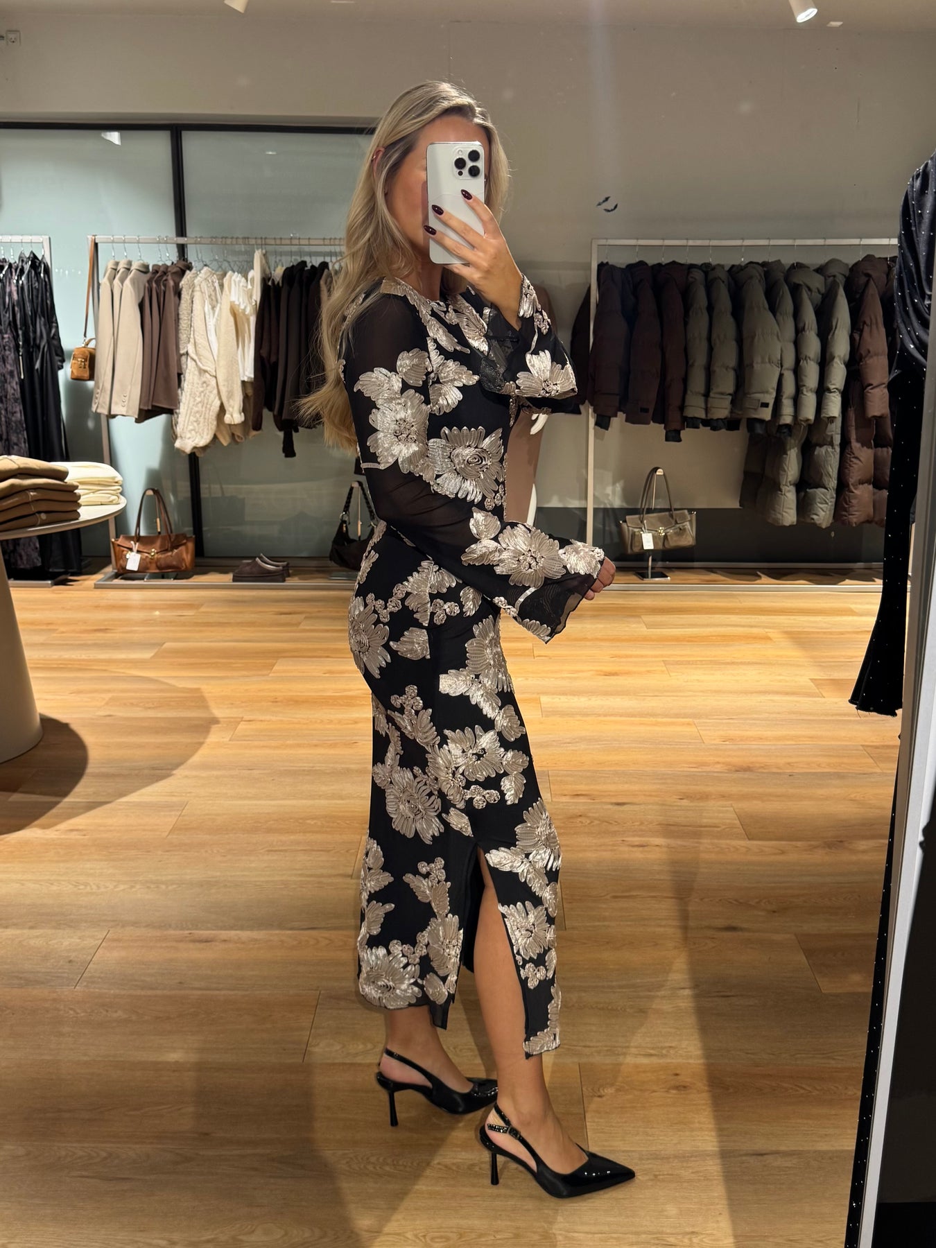 Bella kjolen har en slids i siderne og lange brede ærmer. Kjolen har en rund udskæring og har det smukkeste blomster mønster.