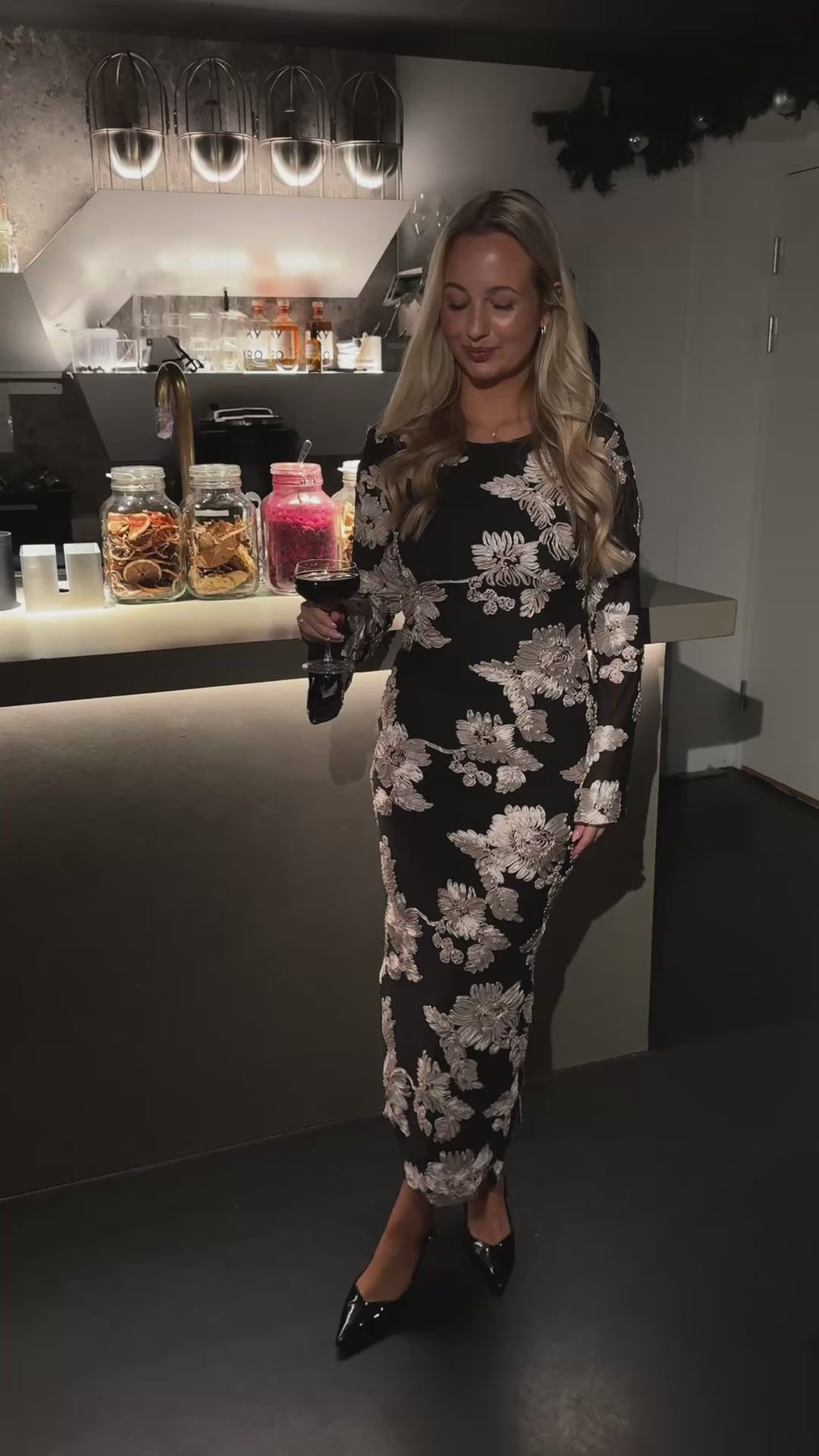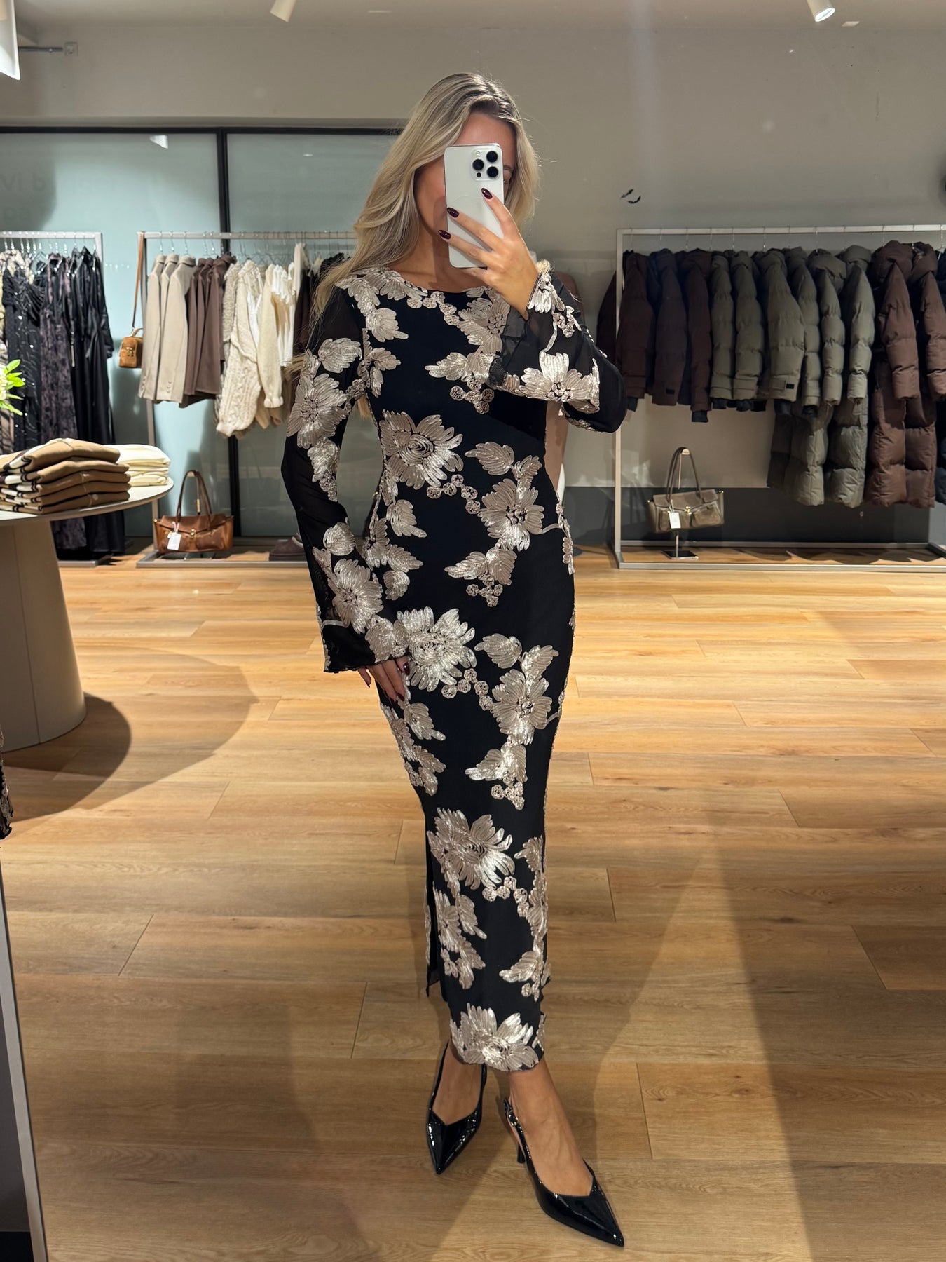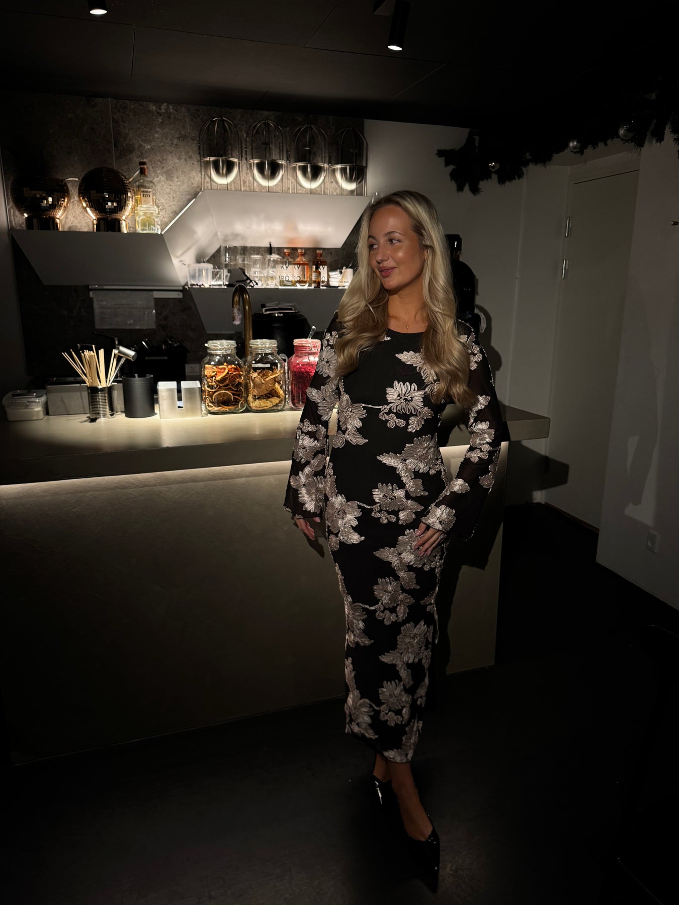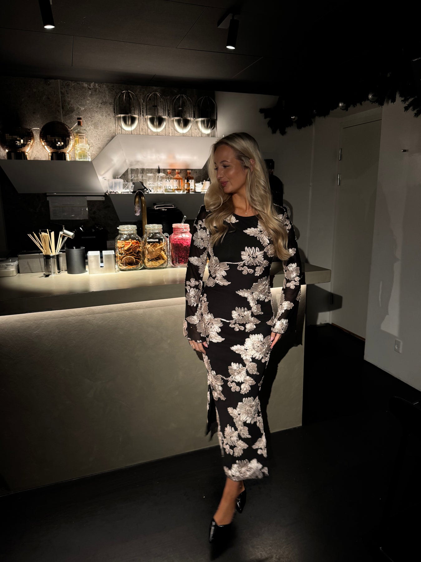 Bella kjolen har en slids i siderne og lange brede ærmer. Kjolen har en rund udskæring og har det smukkeste blomster mønster.