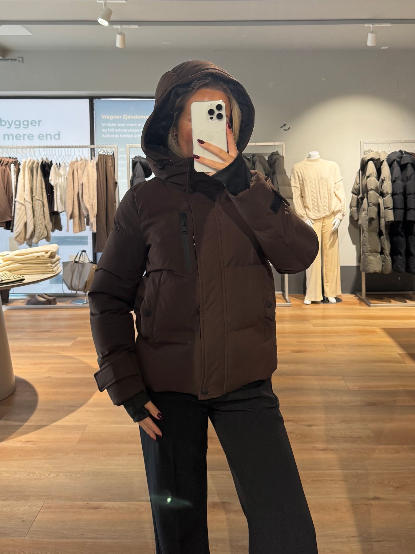 Caya jakken har har en høj hals og hætte den har en ekstra lomme ved brystet og 2 i siden.