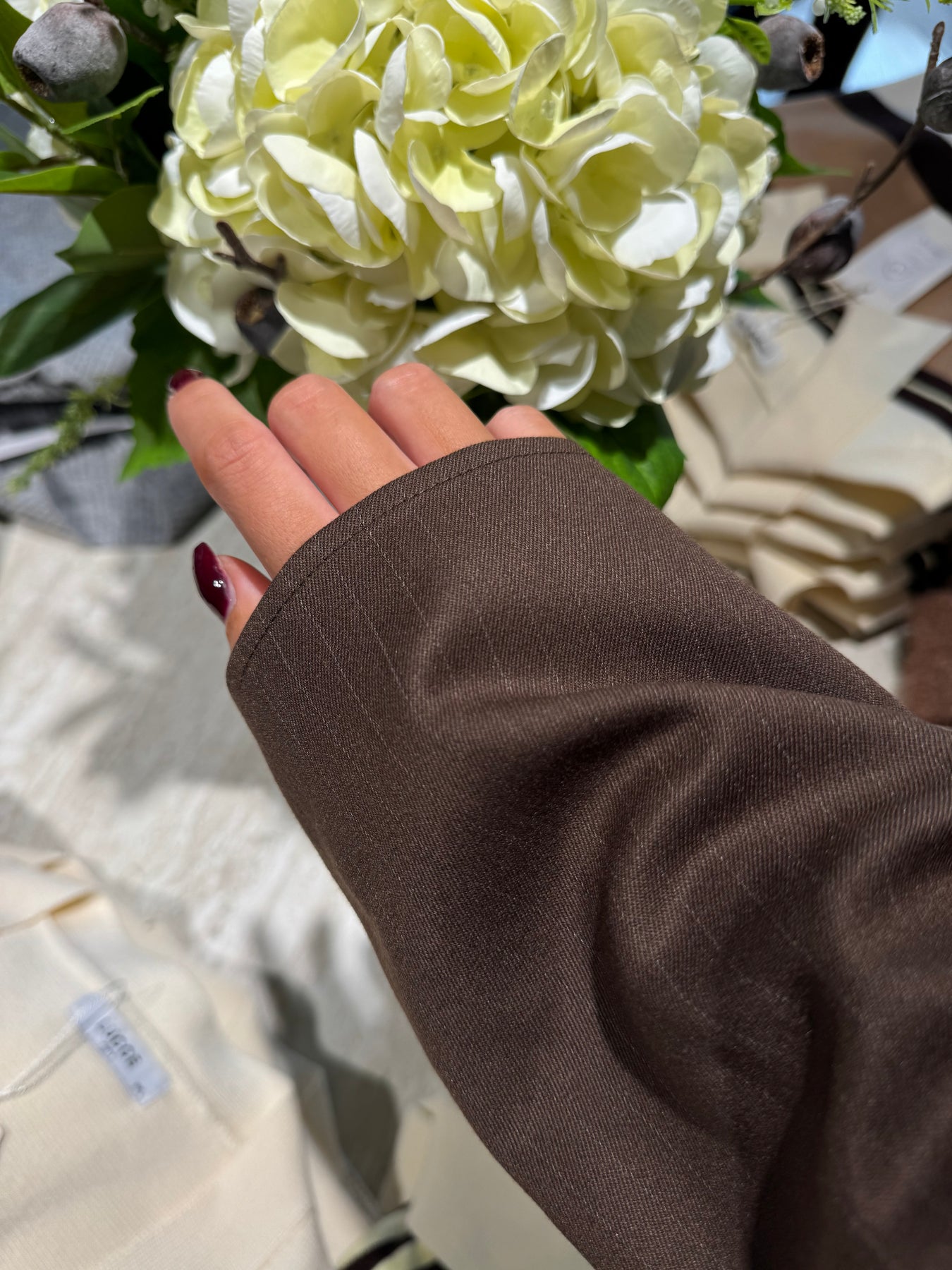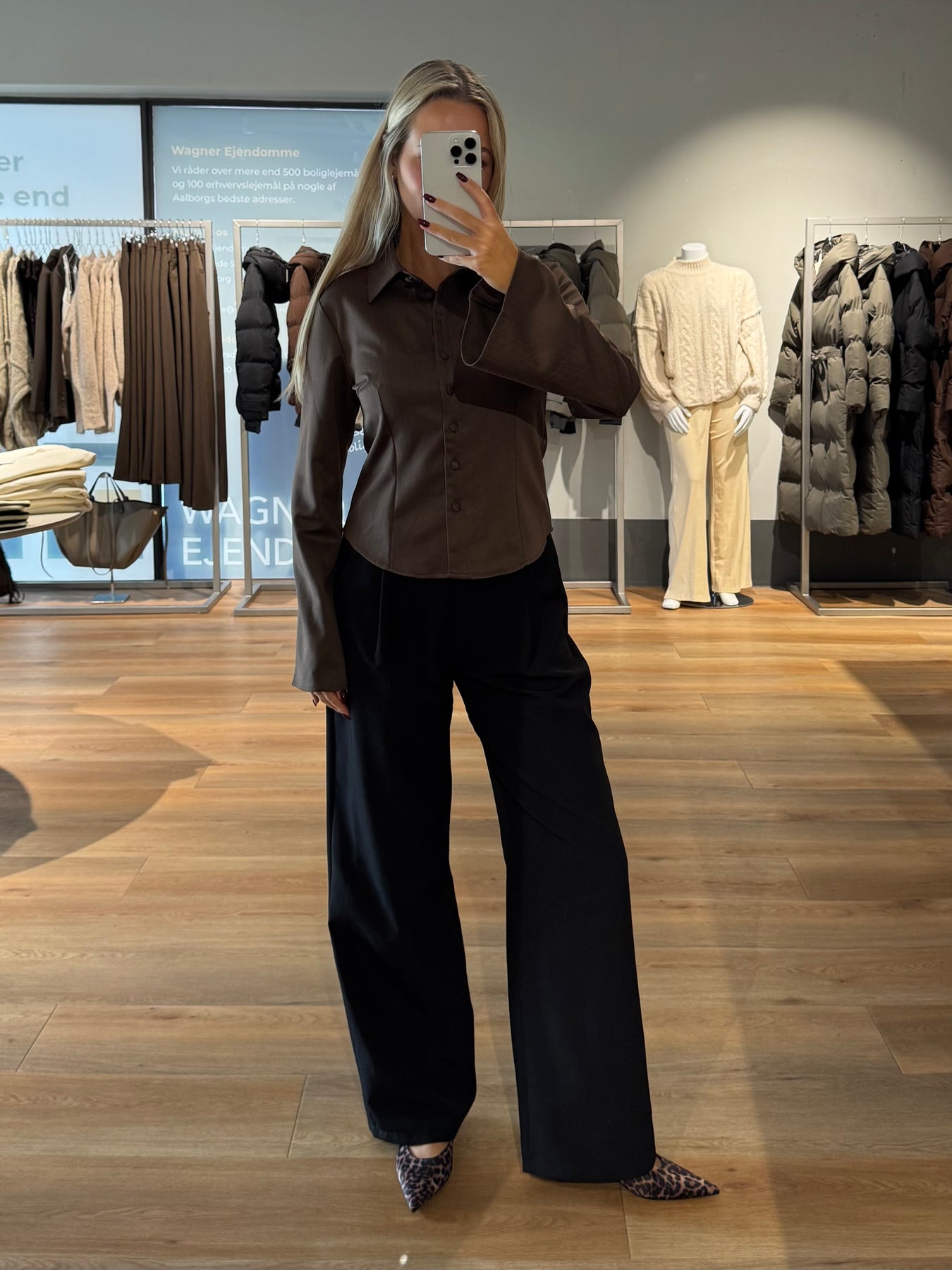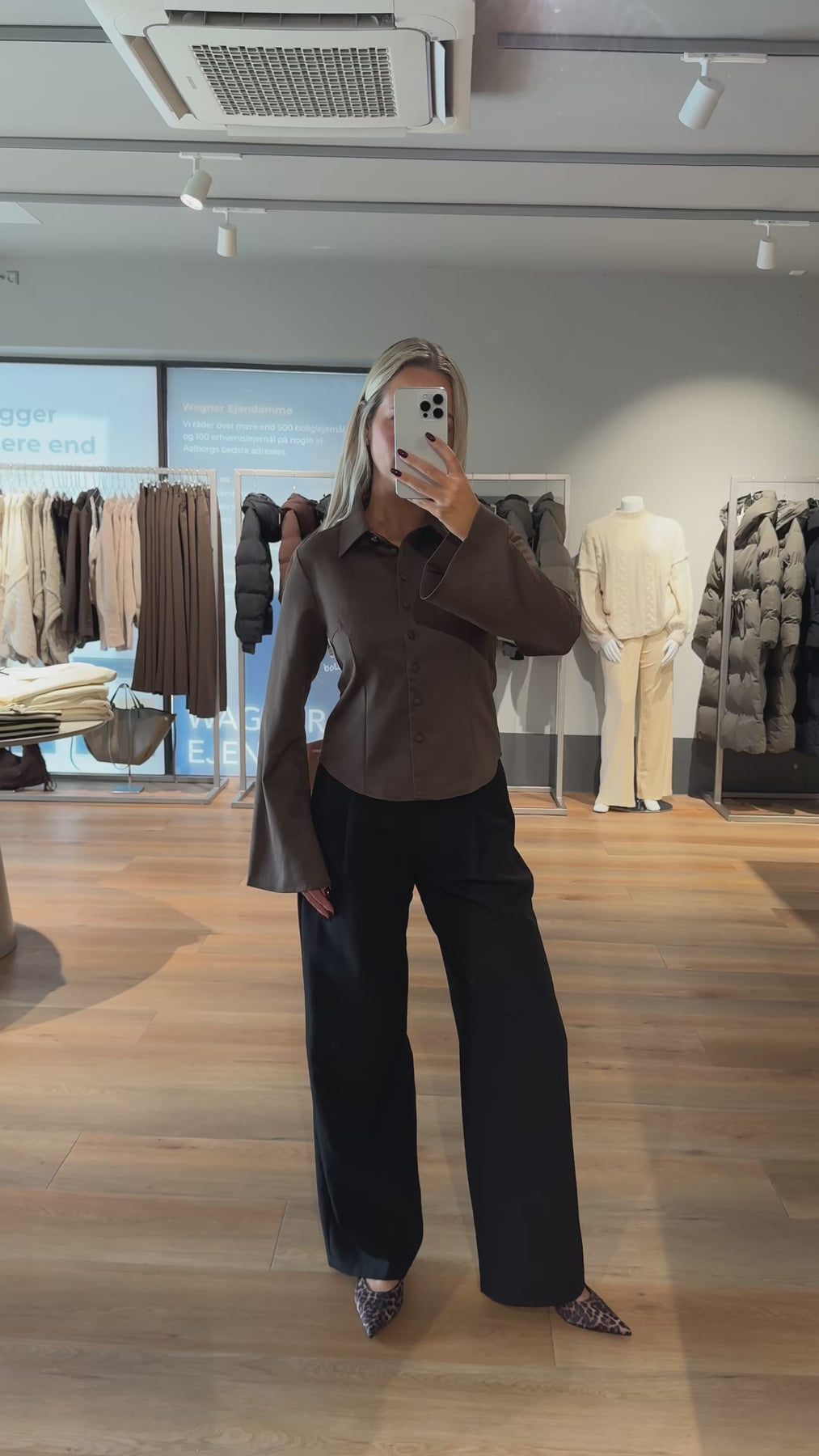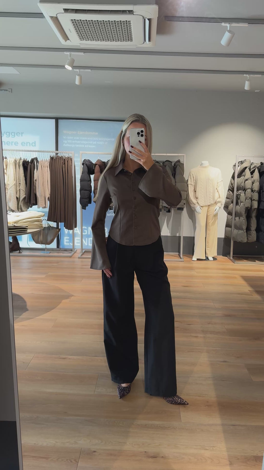 Skjorten har de fineste tynde striber og brede ærmer. Den går ind i taljen og fremhæver figuren.