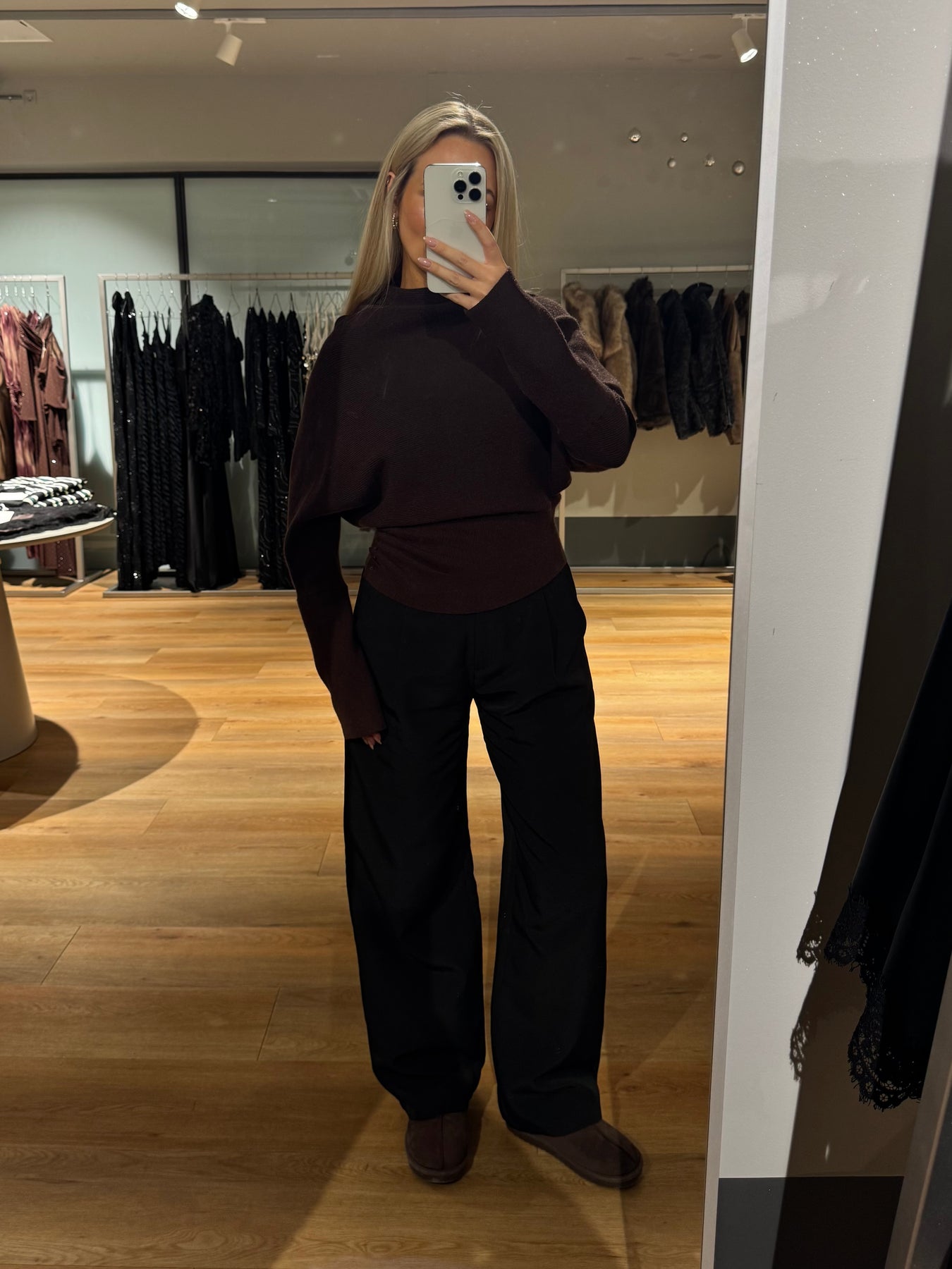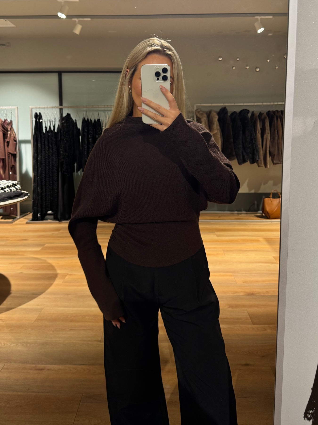 Ella strikken har en vandfalds hals og en løs pasform omkring bryst og mave. Den går ind omkring hoften og har ekstra lange ærmer.