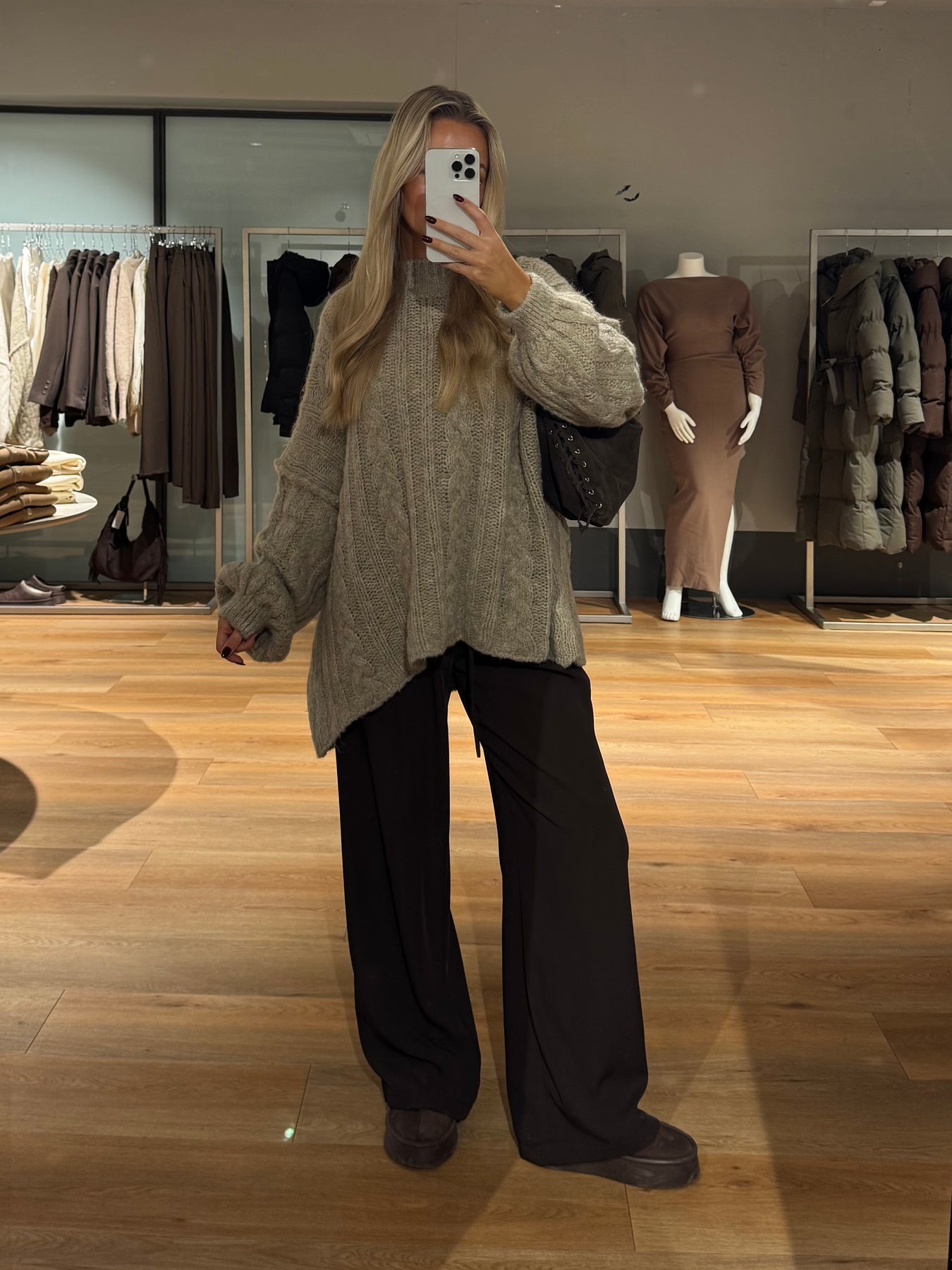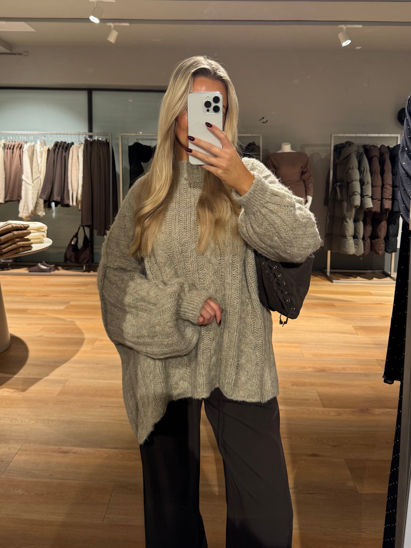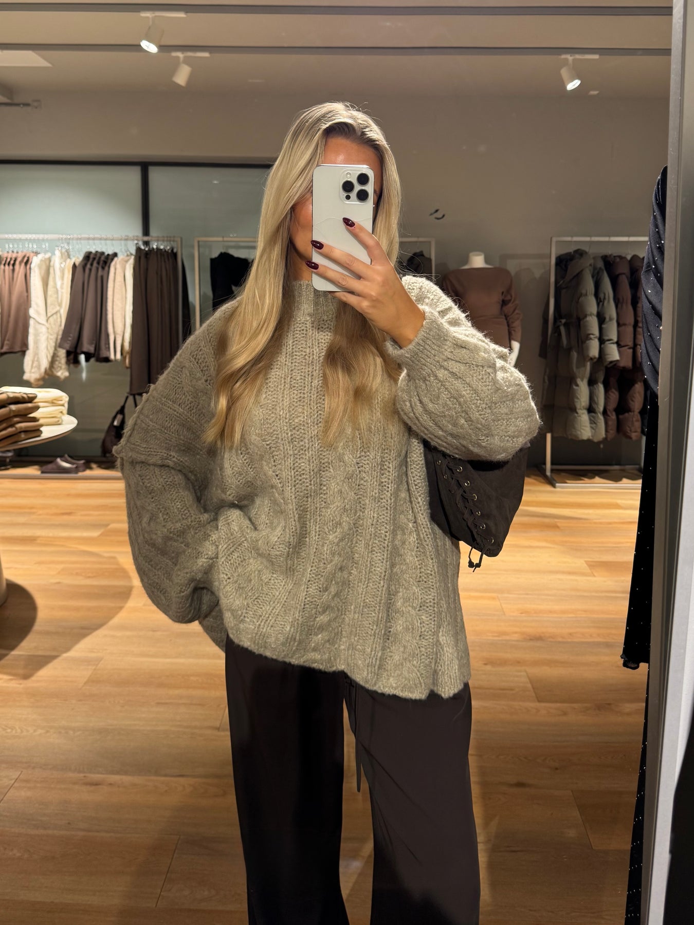Helene strikken har en høj hals og det fineste kabel strik. Den har afslappede skuldre og er bred i bunden.