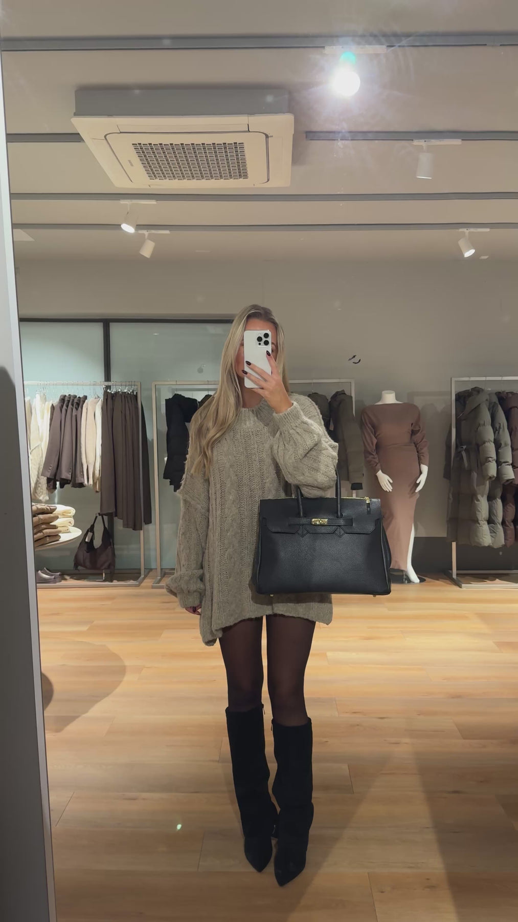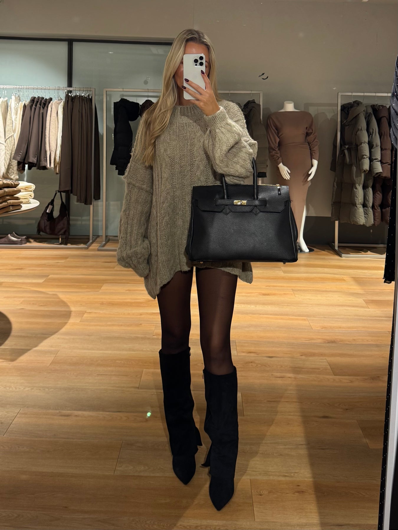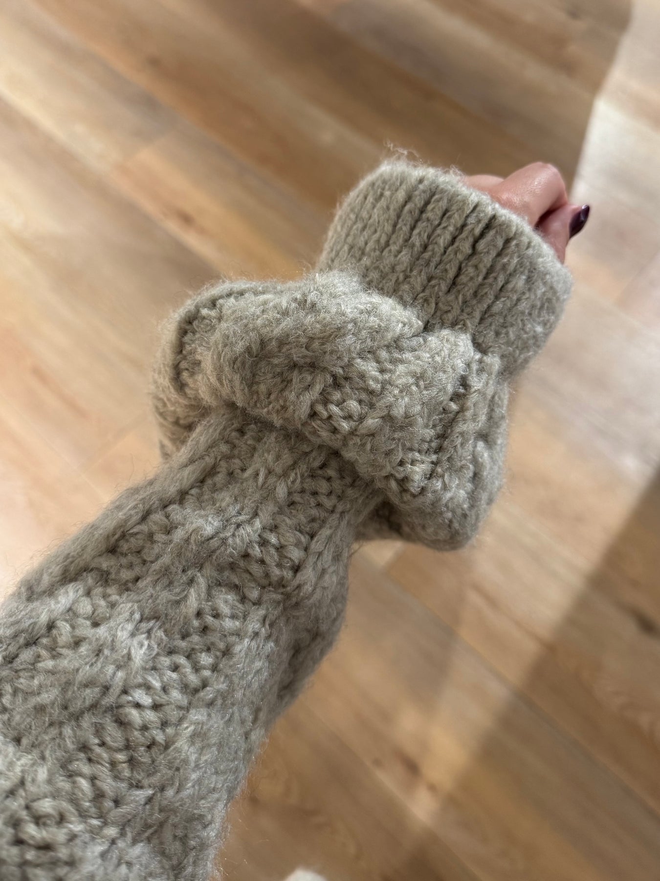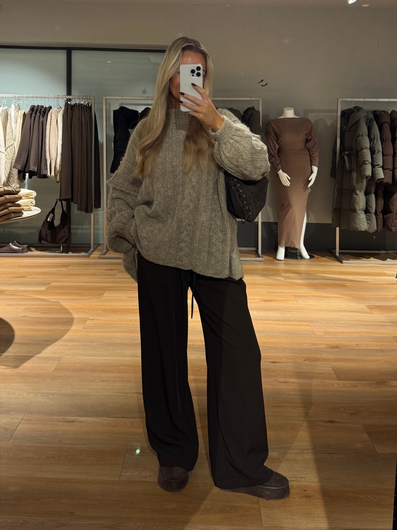 Helene strikken har en høj hals og det fineste kabel strik. Den har afslappede skuldre og er bred i bunden.