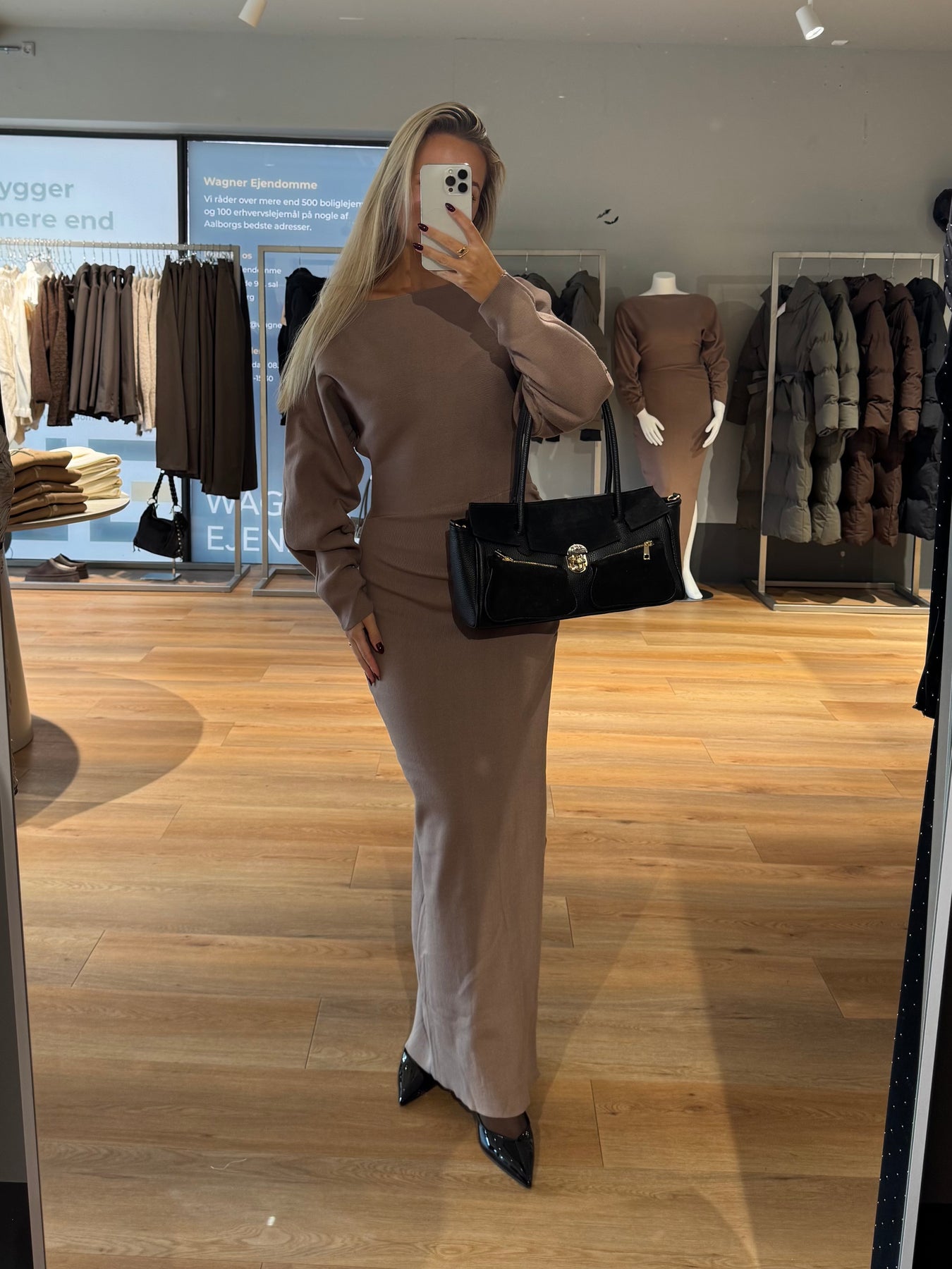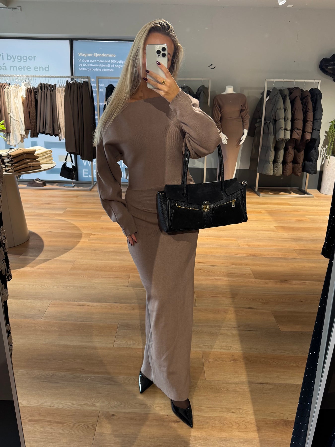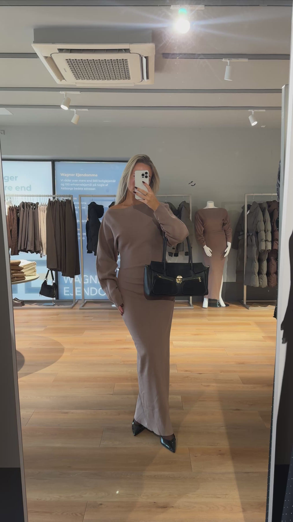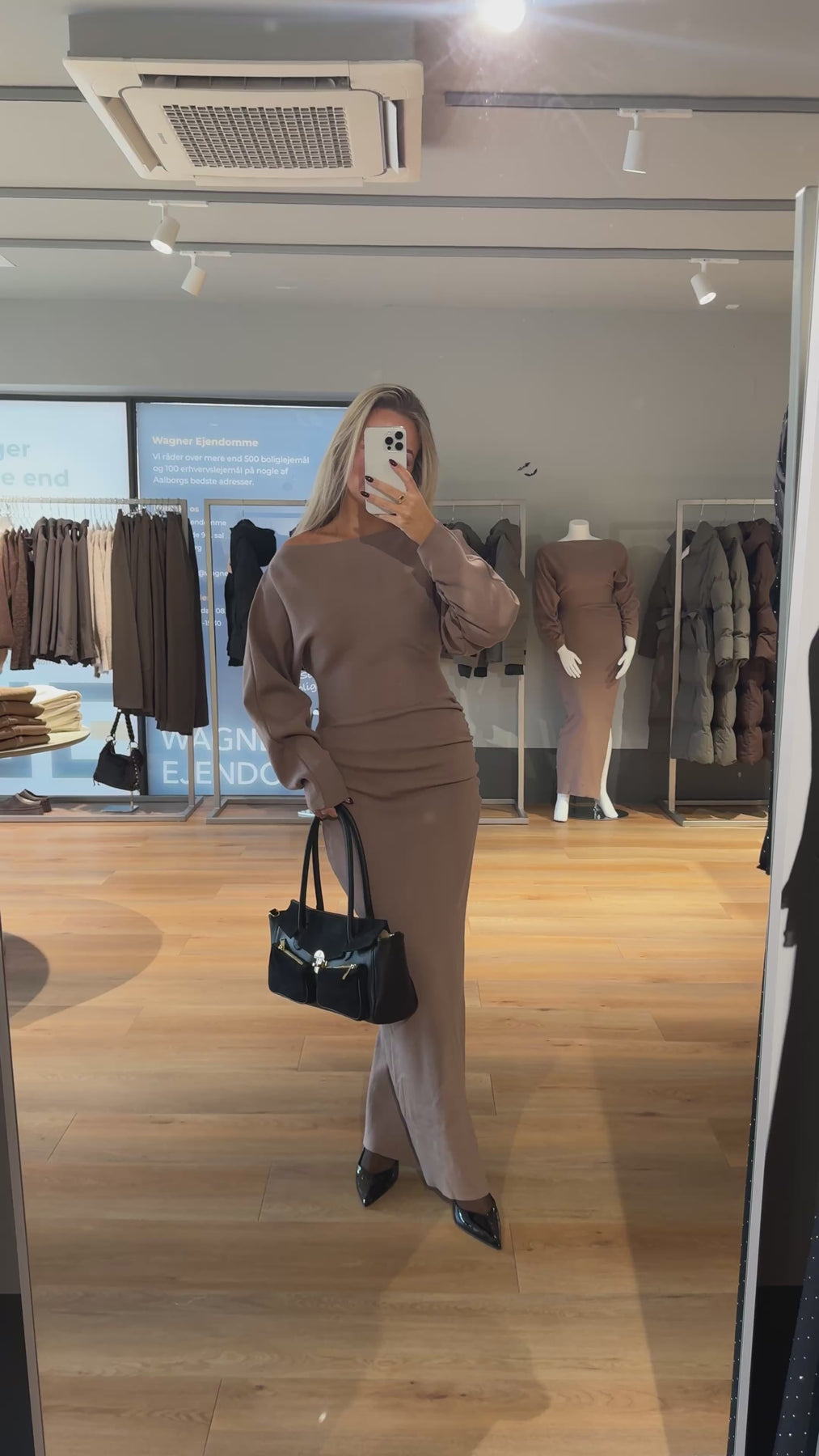 Jenny strikkjolen er perfekt til efteråret - den fine strik holder dig varm på de kolde dage. Den har scrunch i siden og på ærmerne, som giver den ellers klassiske kjole et pint.