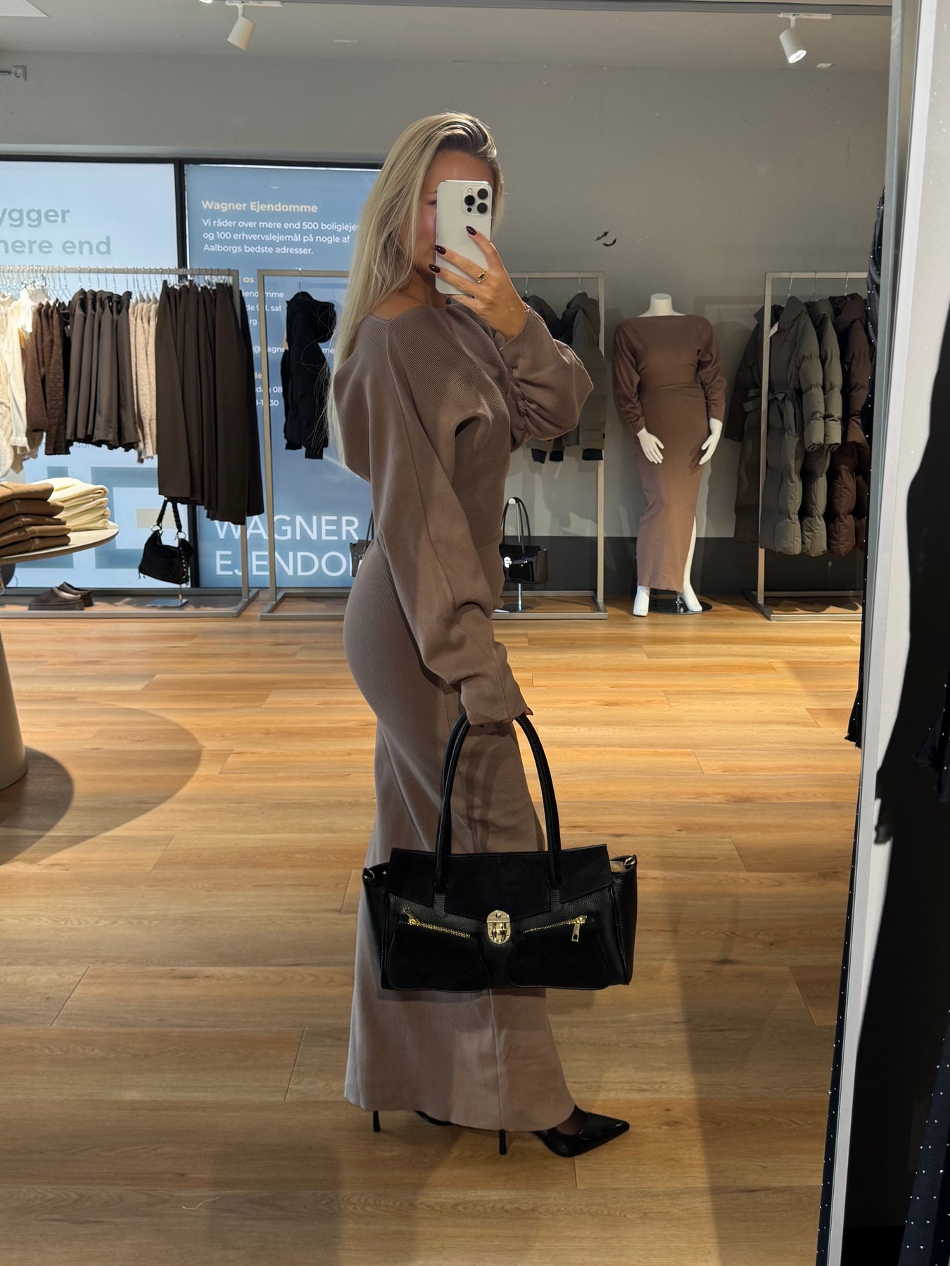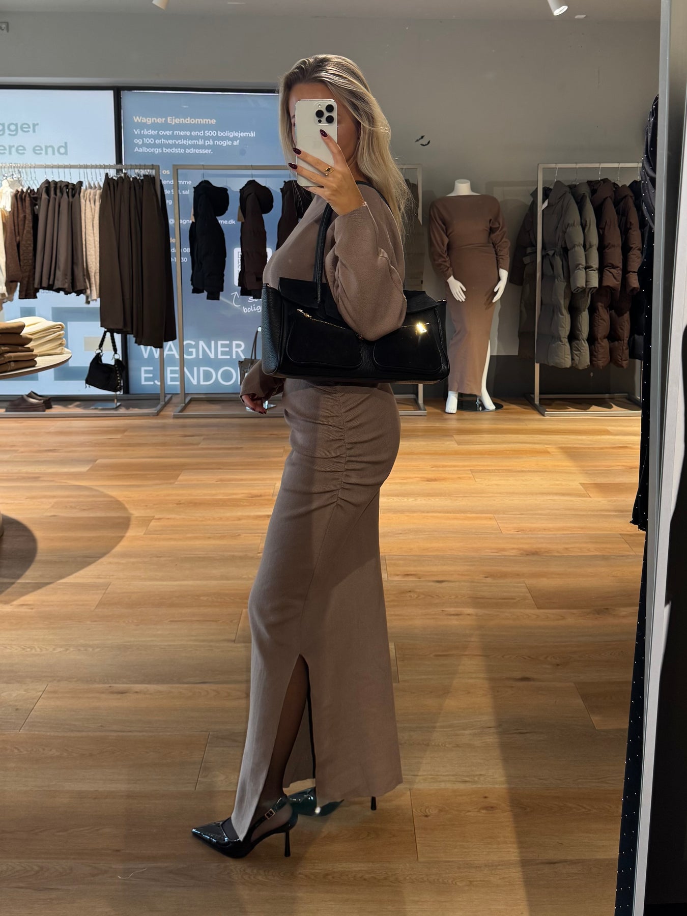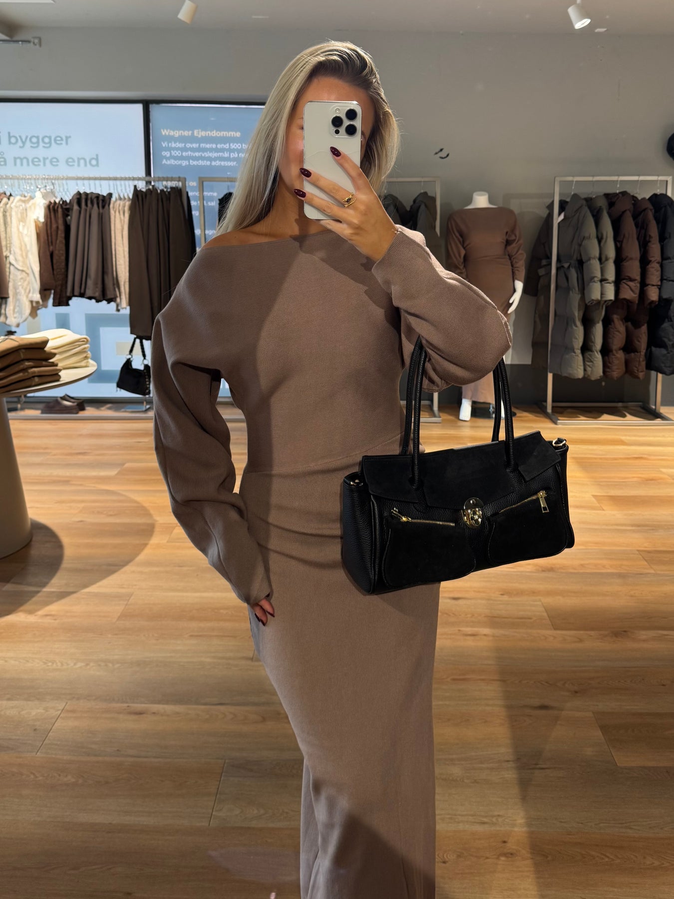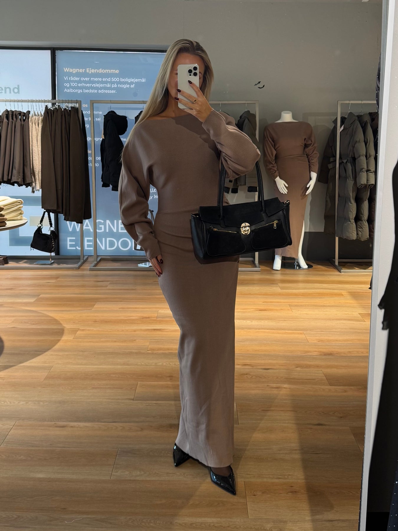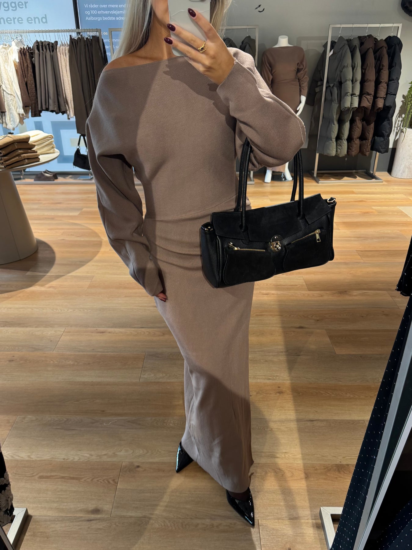 Jenny strikkjolen er perfekt til efteråret - den fine strik holder dig varm på de kolde dage. Den har scrunch i siden og på ærmerne, som giver den ellers klassiske kjole et pint.