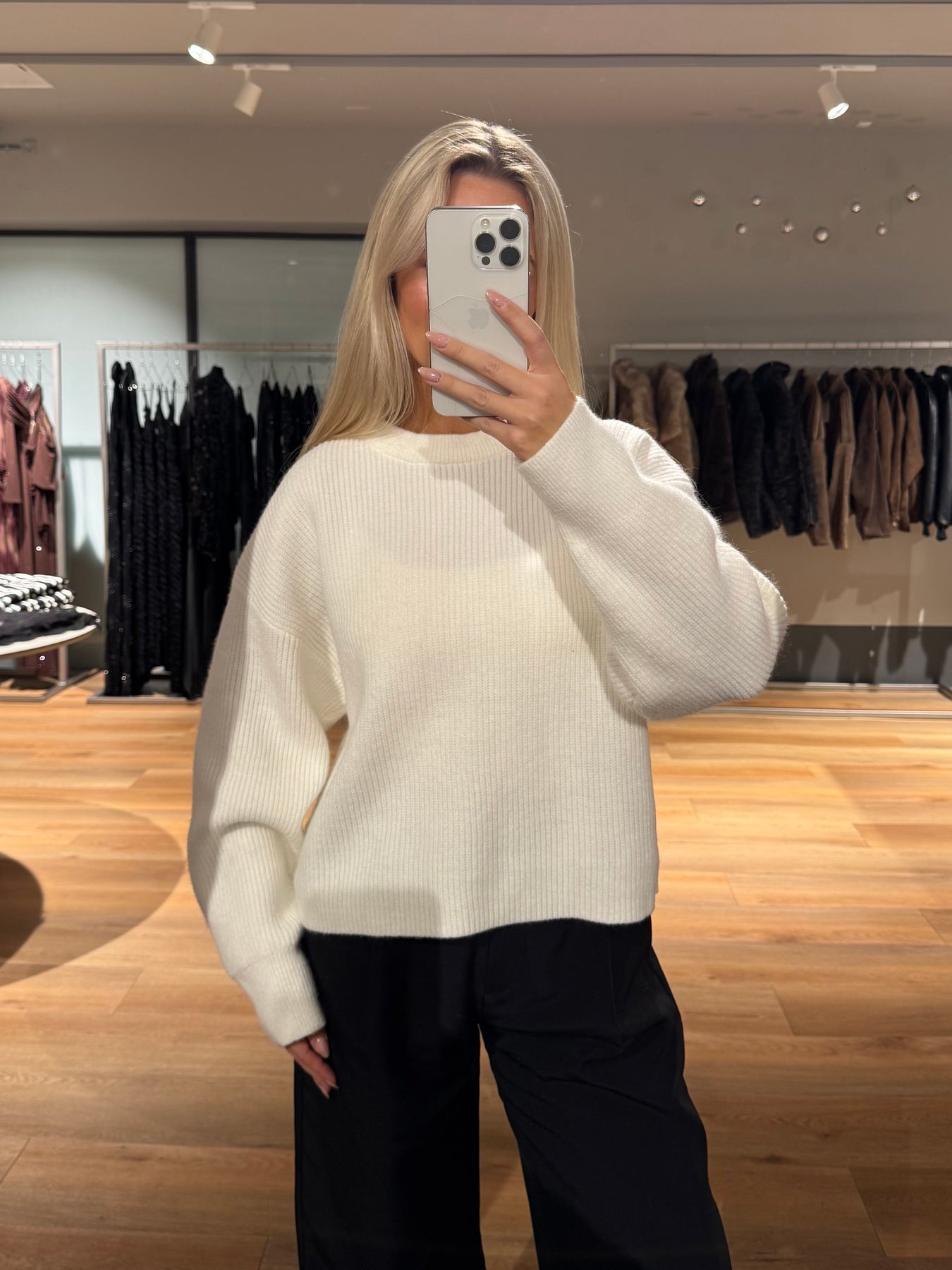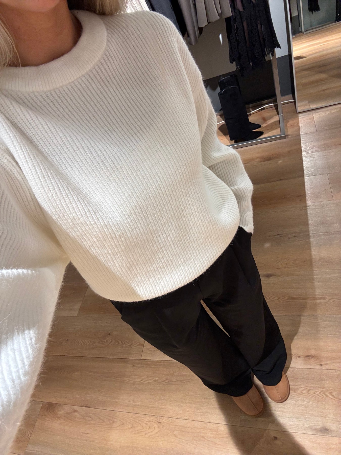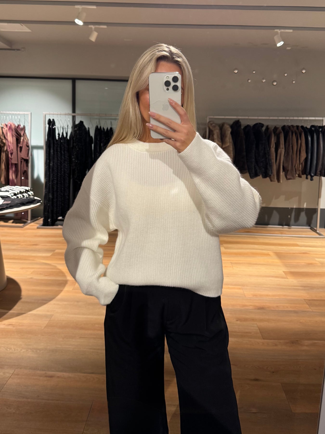 Josefina strikken har en bred halsudskæring. Den har cuffs omkring håndleddet og ellers en løs pasform.
