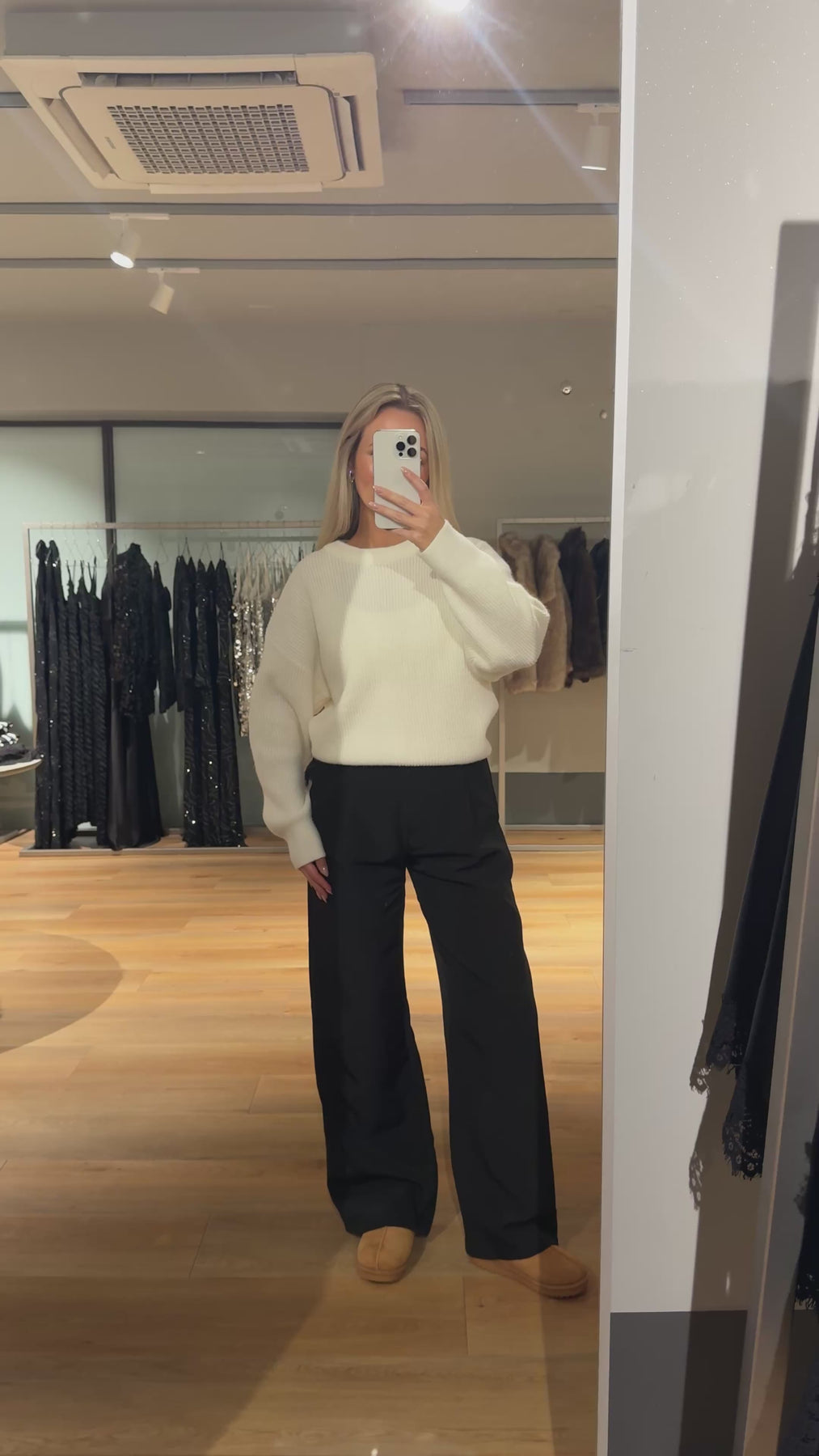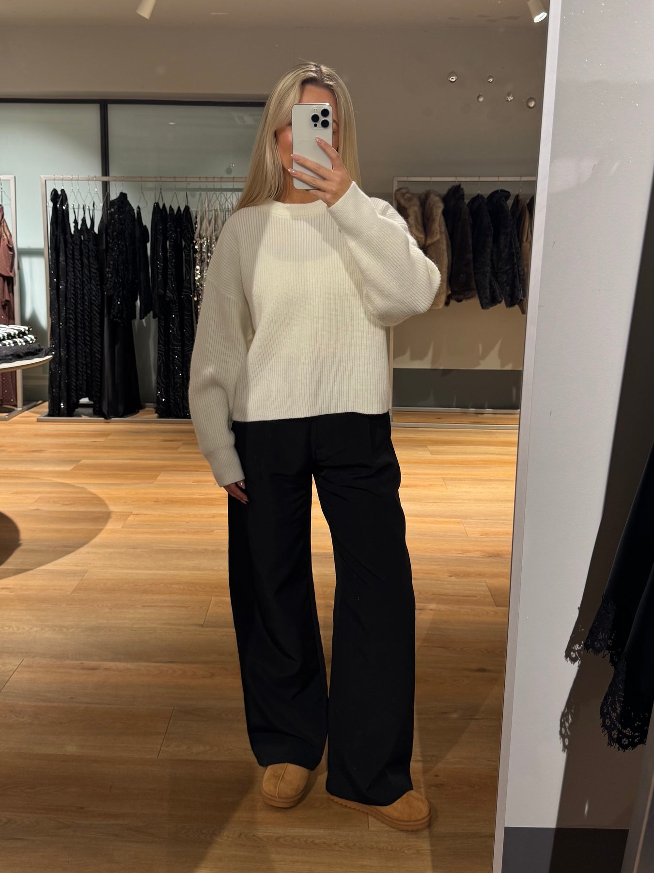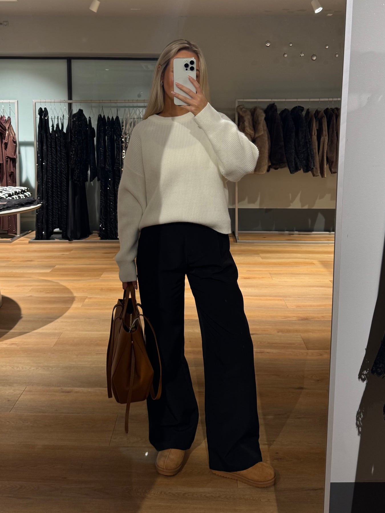 Josefina strikken har en bred halsudskæring. Den har cuffs omkring håndleddet og ellers en løs pasform.