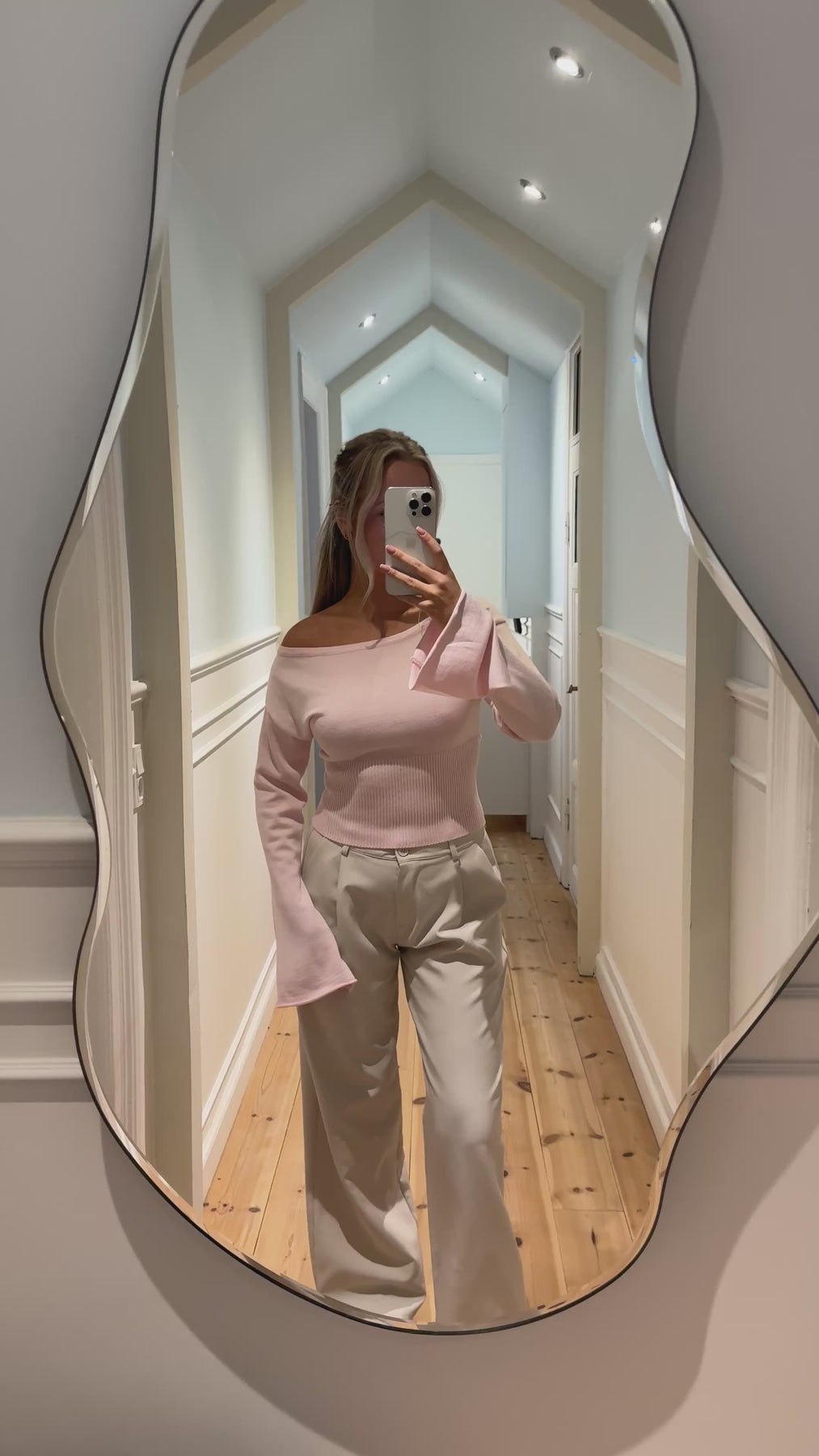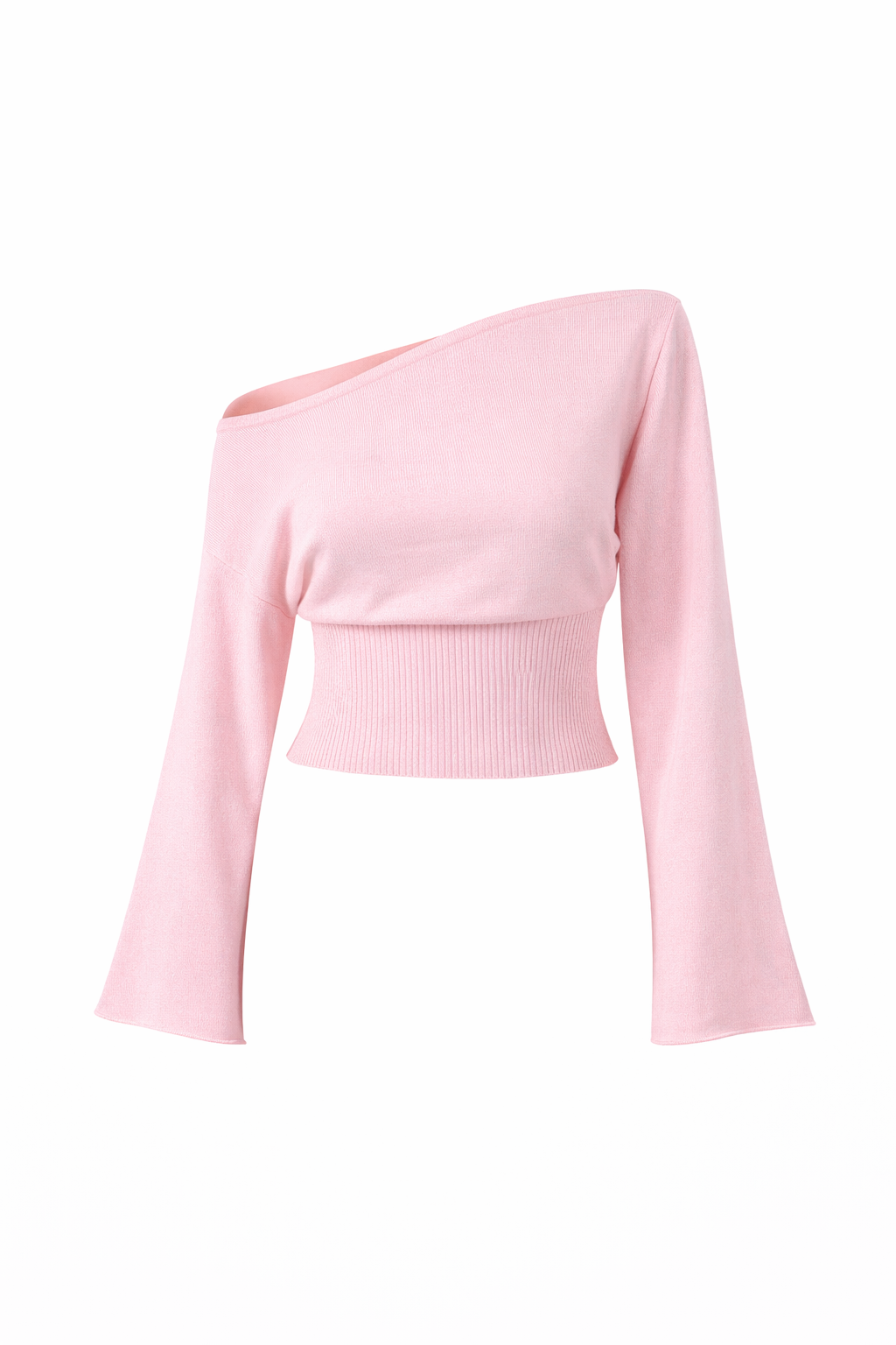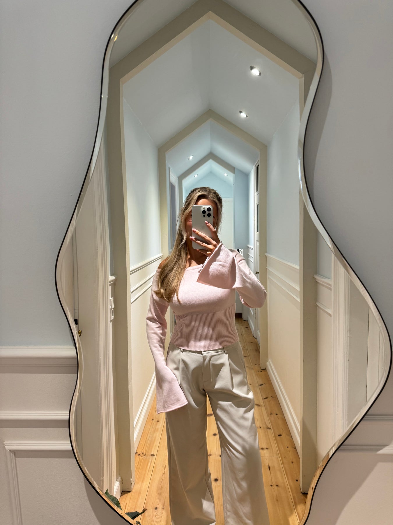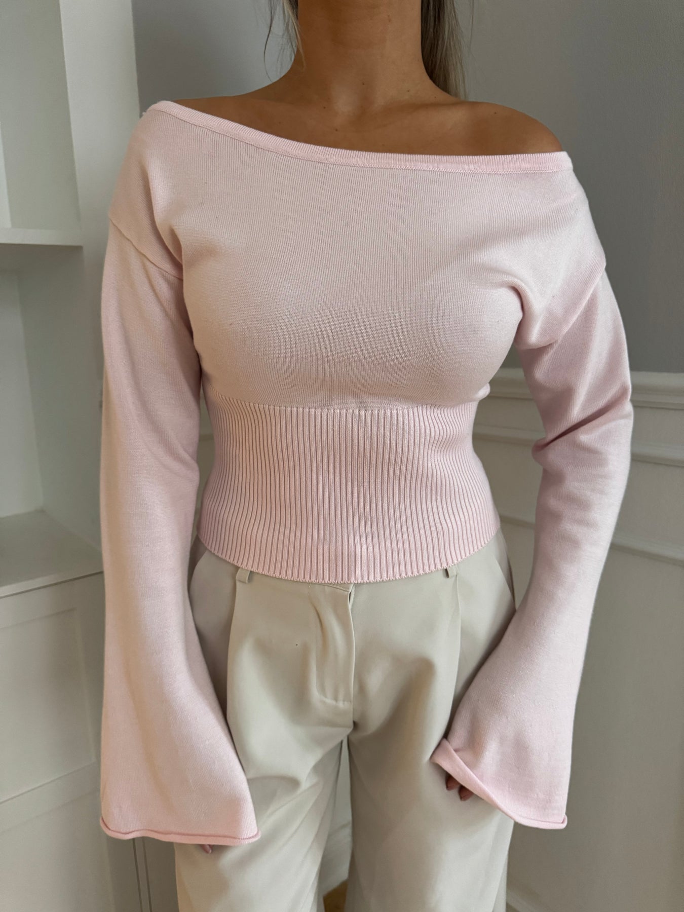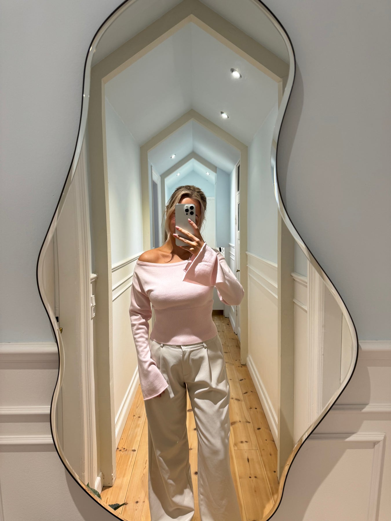 Leonora er en lyserød strikbluse med et elegant off-shoulder udtryk, der giver et moderne og feminint look. Det figursyede snit med ribkant i taljen fremhæver silhuetten på smuk vis, mens de lange, let udvidede ærmer tilfører et eksklusivt og sofistikeret touch.