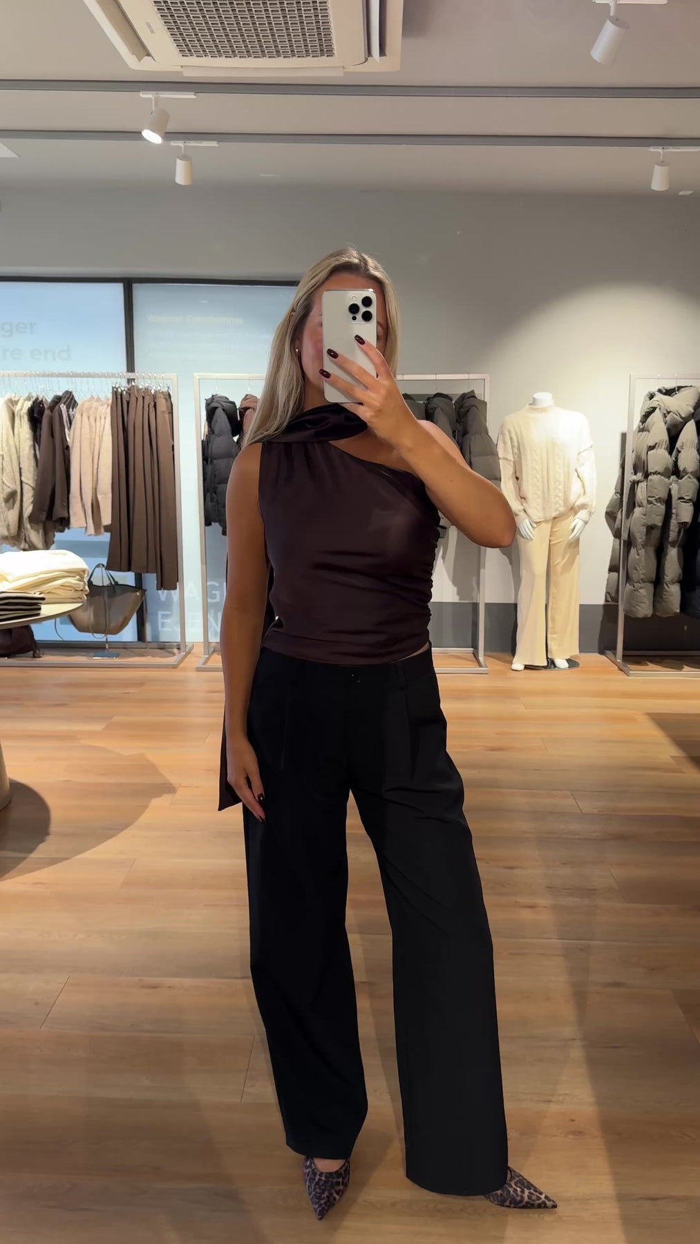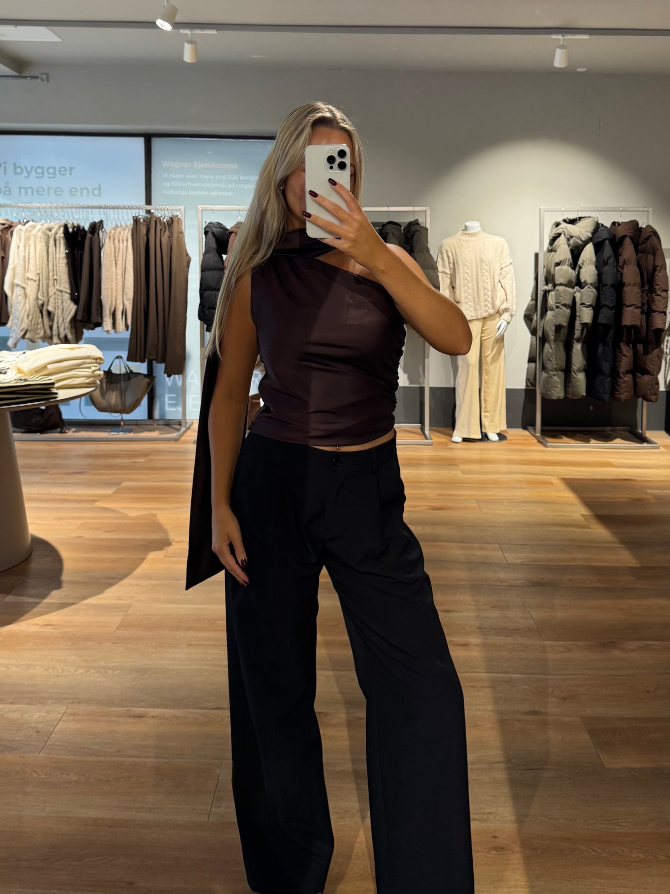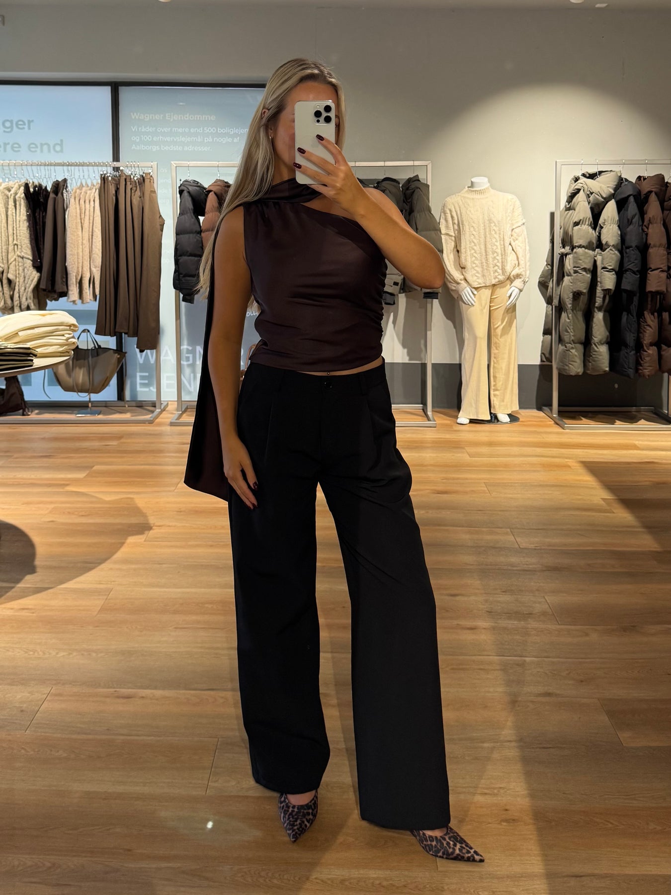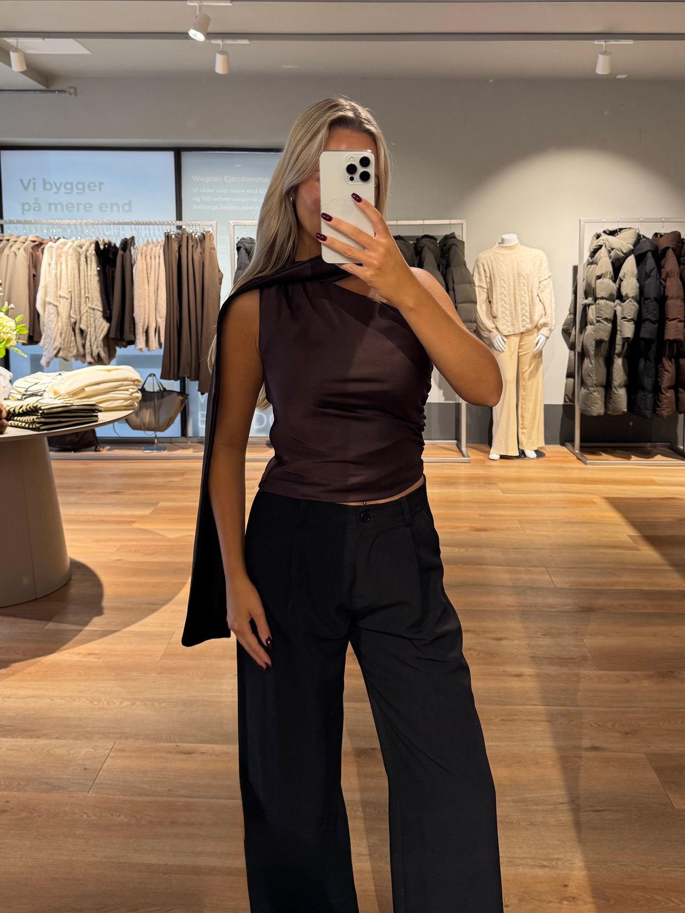 Margot toppen har en fri skulder og et fint stykke stof som går omkring halsen. Den er tætsiddende men har de fineste rynker, som giver blusen lidt mere form.