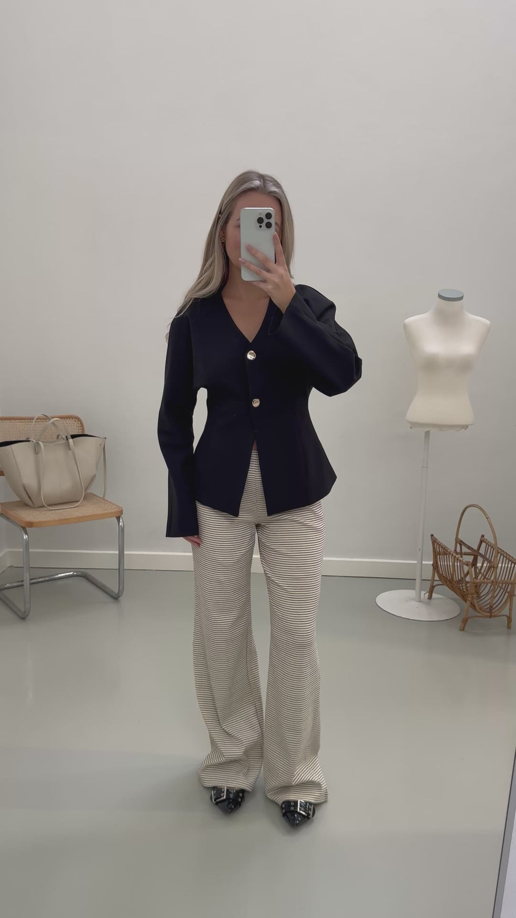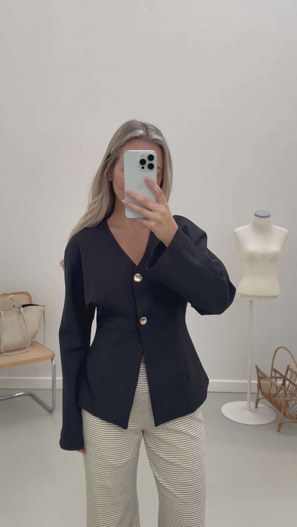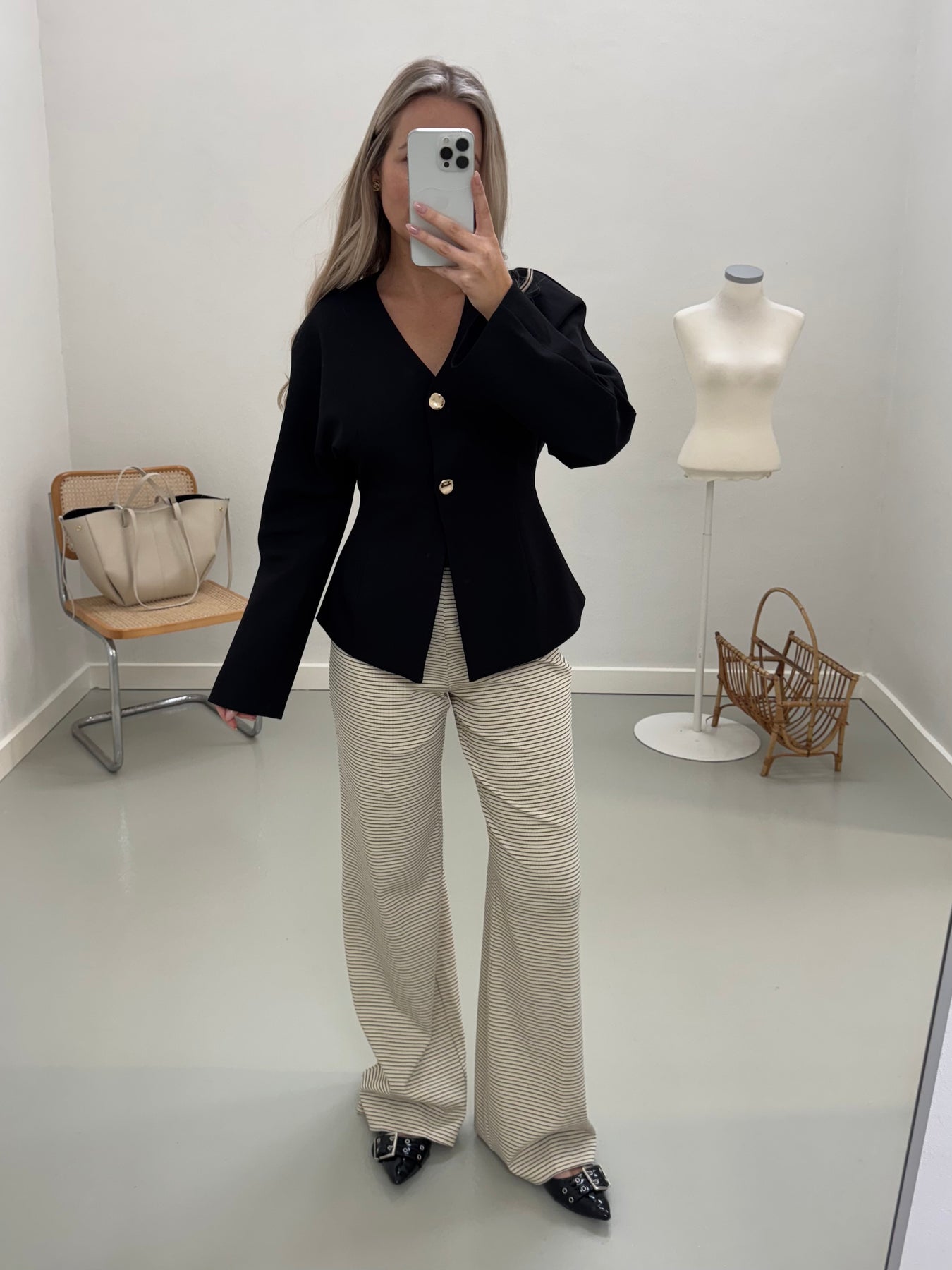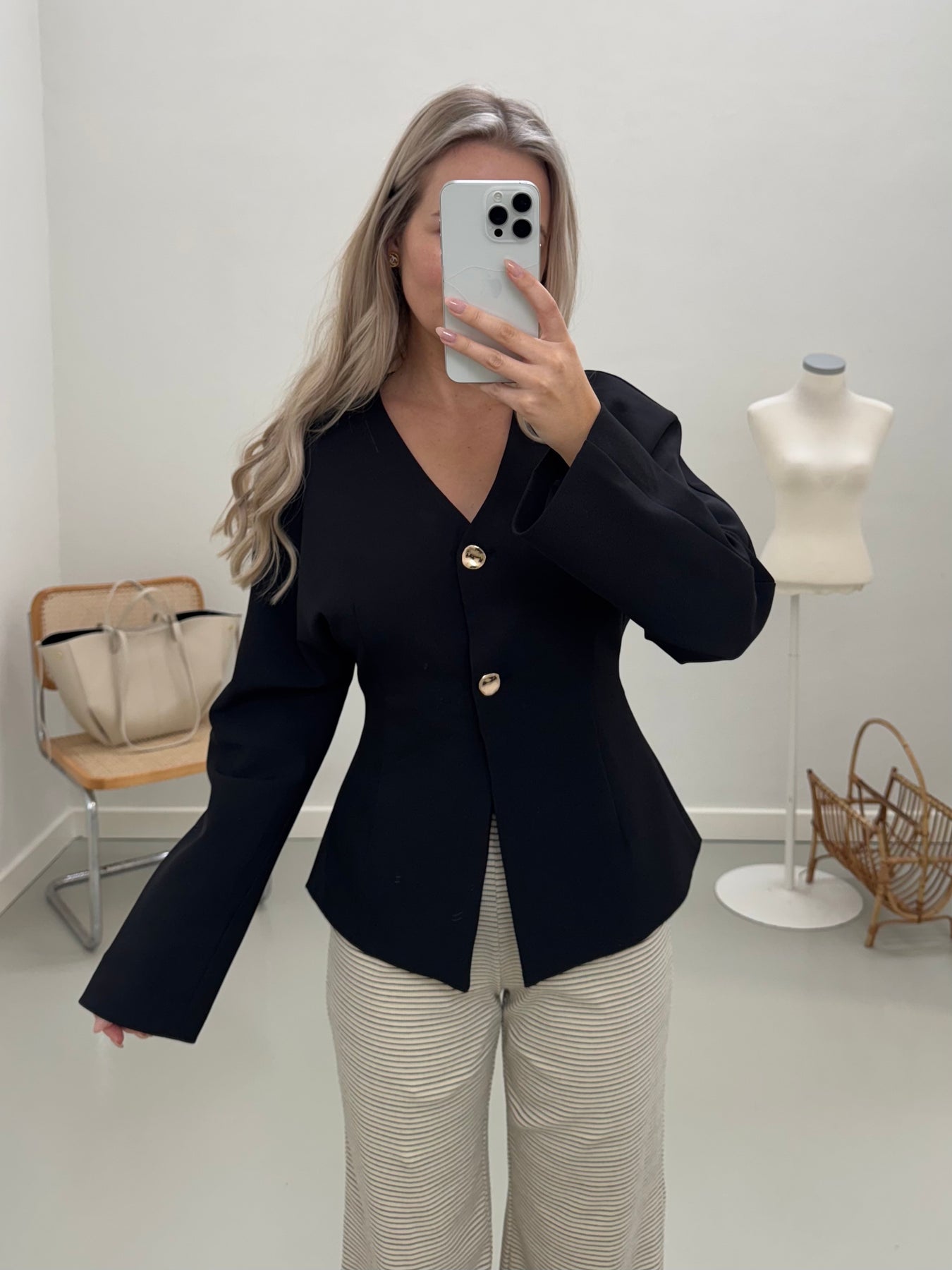 Vores Mia blazer lukkes fortil med 2 knapper. Den går ind i taljen og fremhæver figuren. Blazeren har en v-udskæring og brede ærmer.