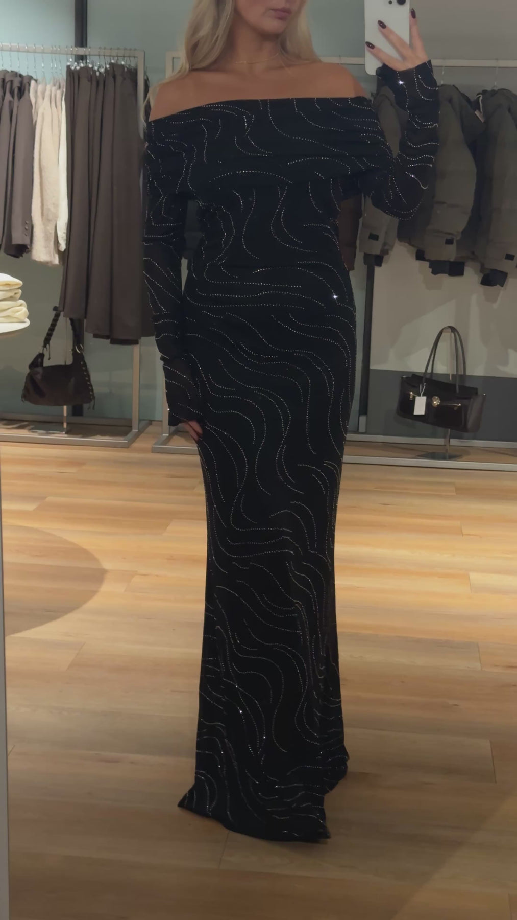Nicole glimmerkjolen hat et off-shoulder look. Kjolen er tætsiddende og lang. Kjolen er perfekt til årets sidste fester og til nytår.