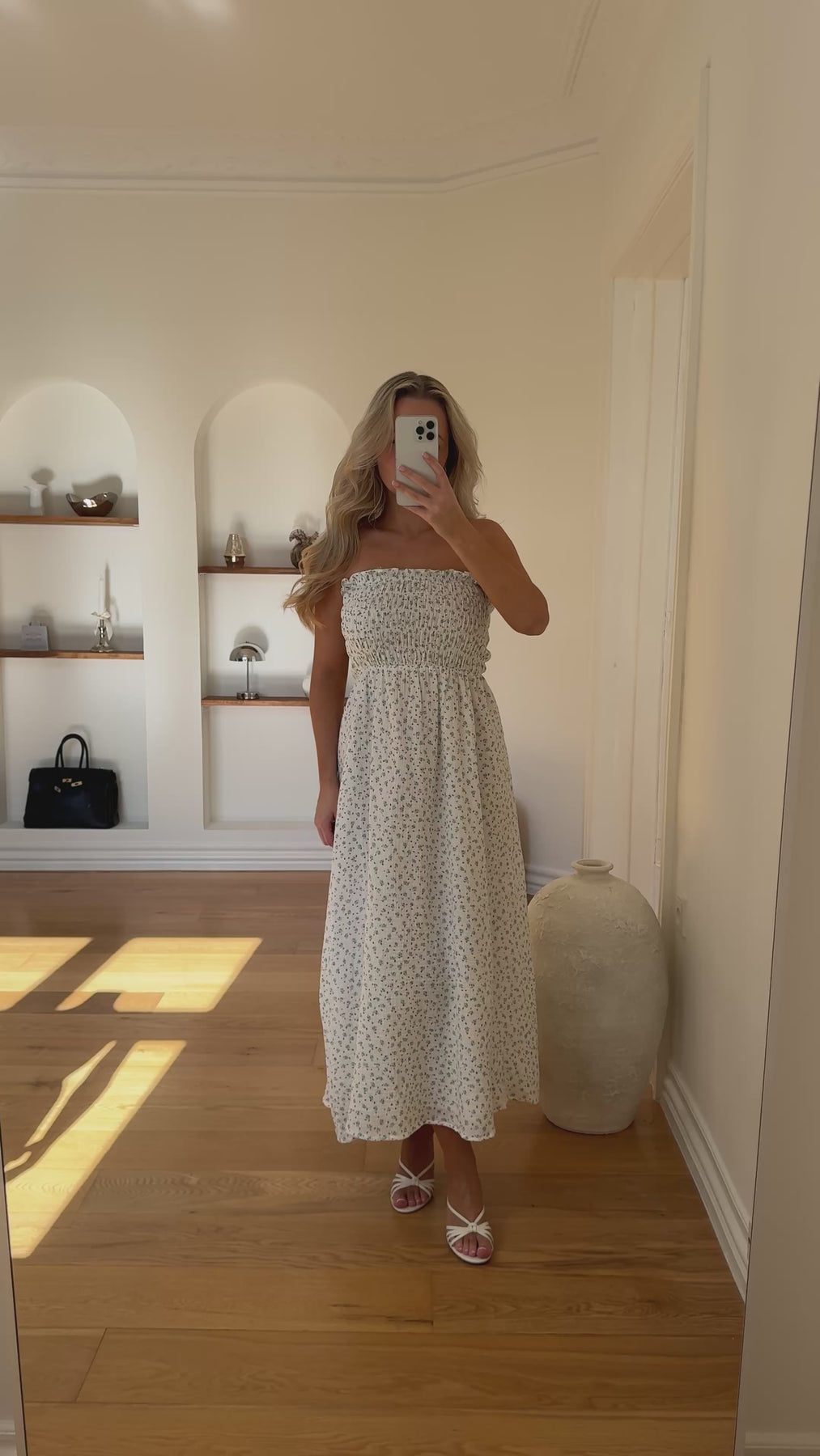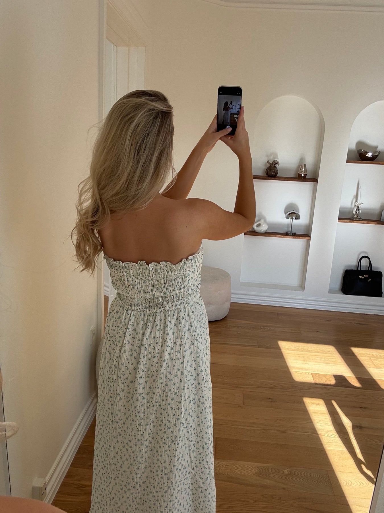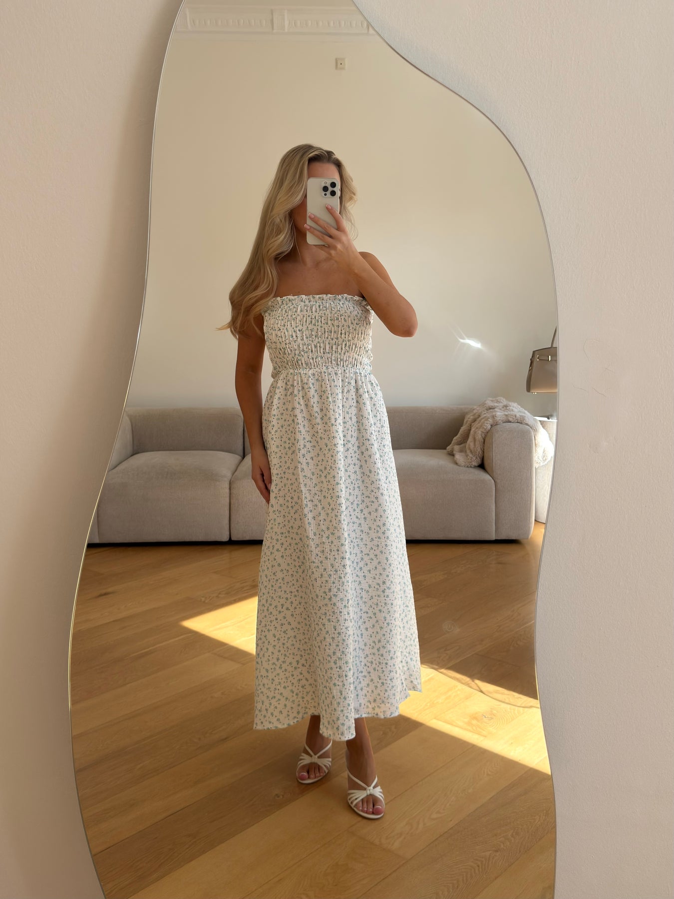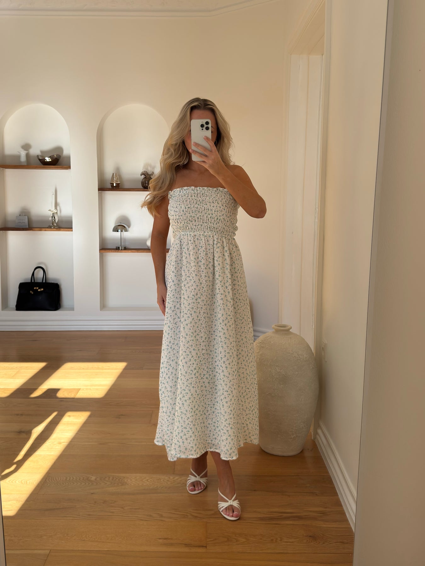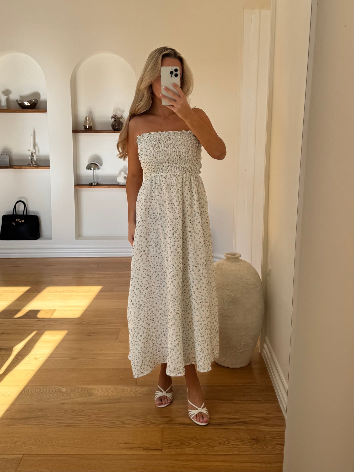 Det fine, diskrete print tilfører et romantisk touch, og det enkle design gør kjolen perfekt til både hverdagsbrug og ferier i solen.
