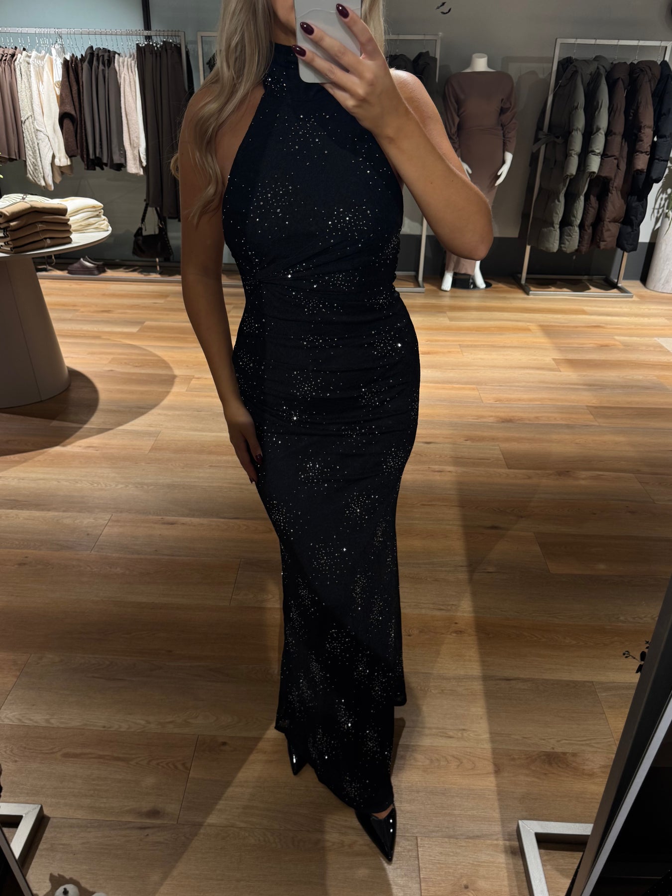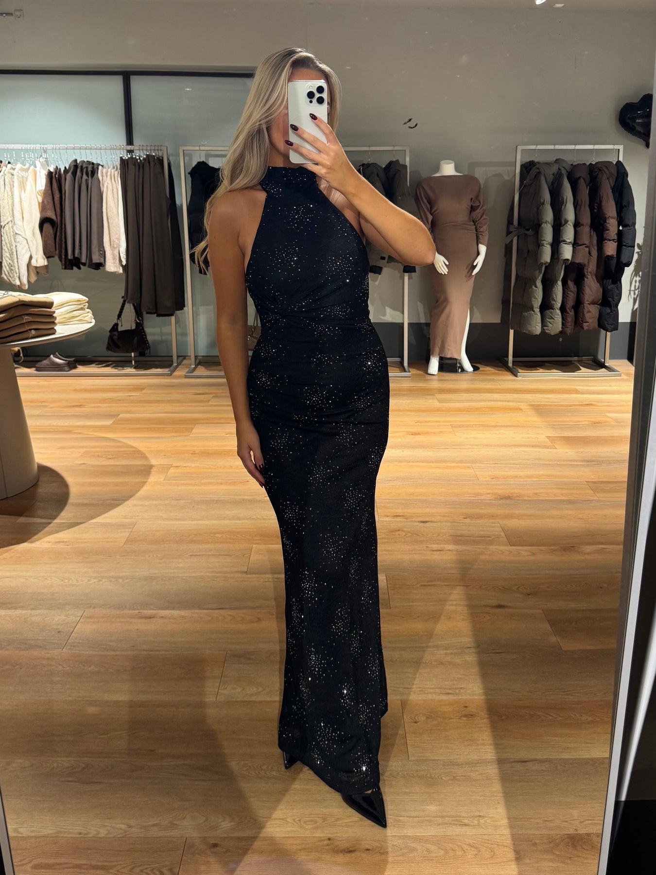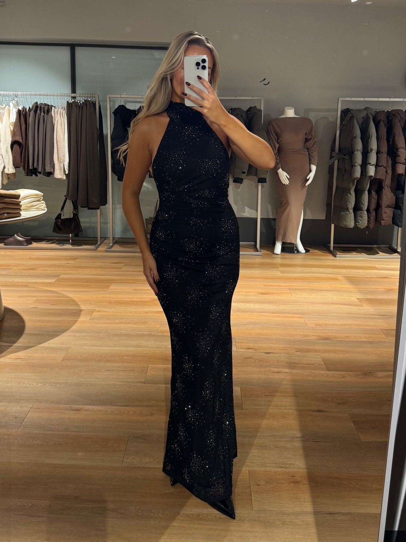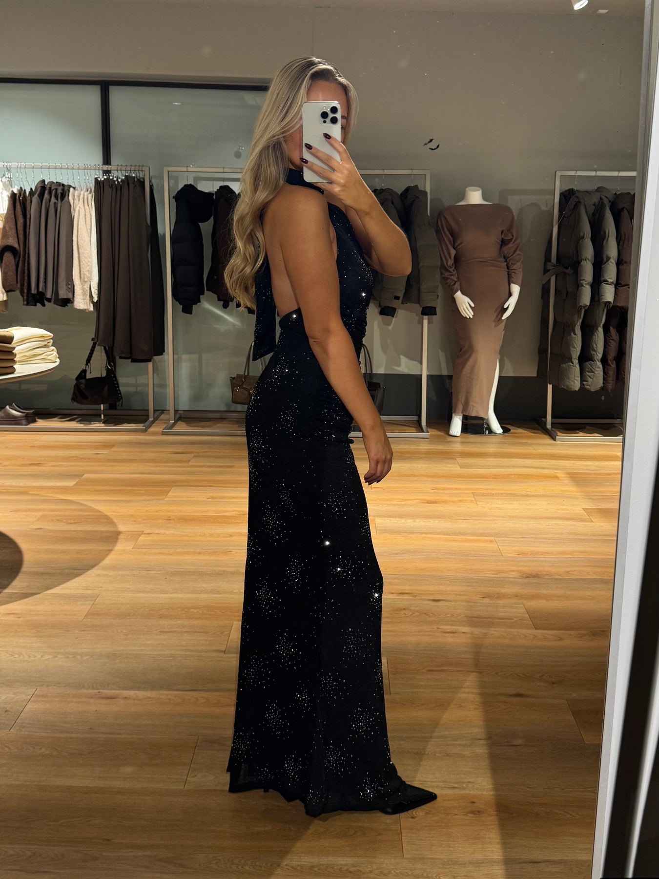 Silvia kjolen har en åben ryg og bindes i nakken. Kjolen har glimmer i stoffet og er perfekt til årets sidste fester. Kjolen er helt perfekt til nytår og de sidste fester.