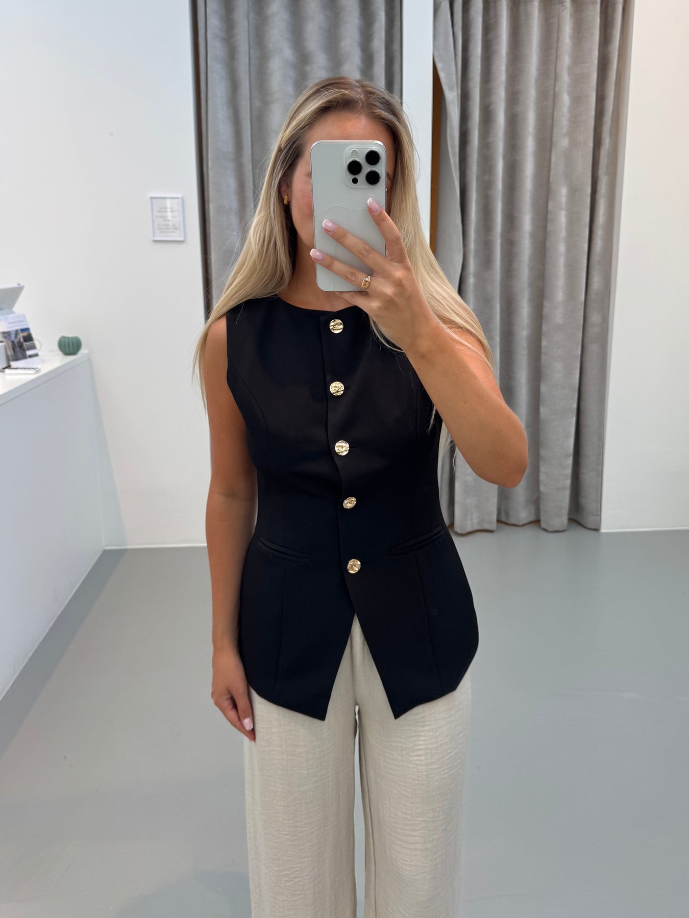 Stella vesten lukkes fortil. Den har en A-åbning i bunden og fremhæver taljen. Vesten er perfekt til hverdag og festlige begivenheder.