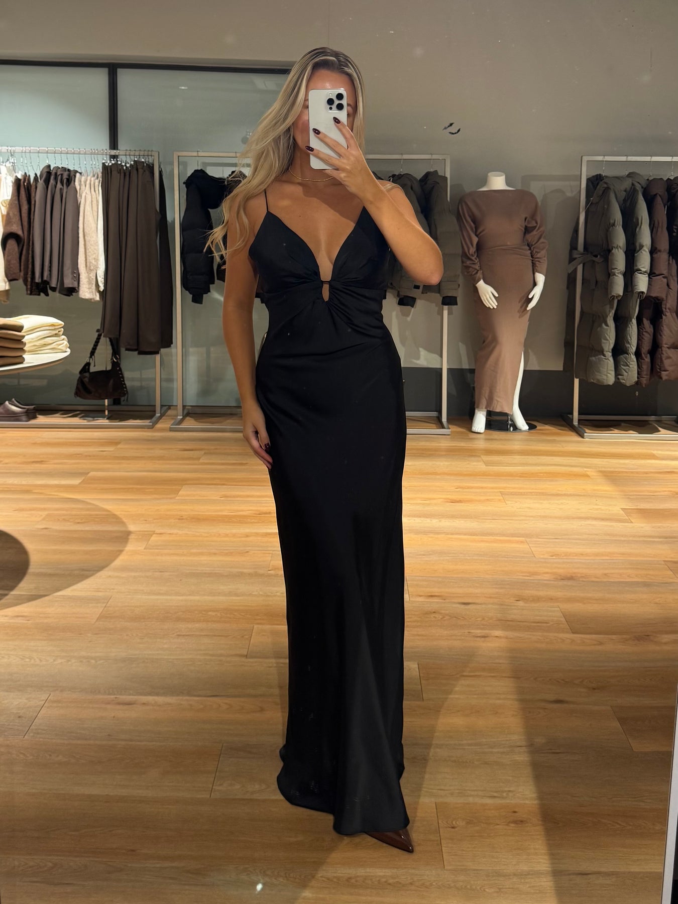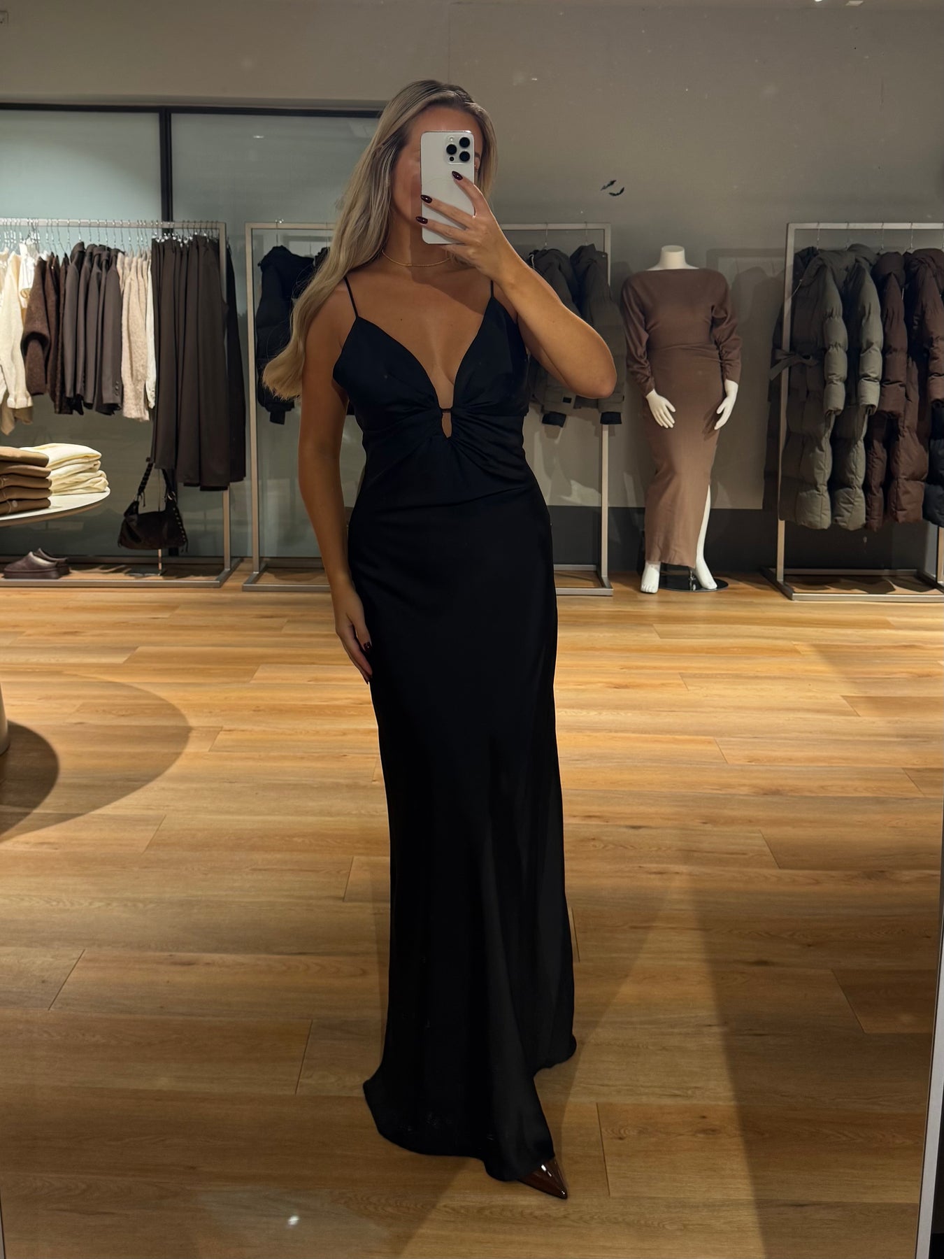 Tania kjolen har en dyb udskæring. Kjolen har en åben ryg og en lille udskæring ved brystet. Kjolen er helt perfekt til årets sidste fester og nytår.