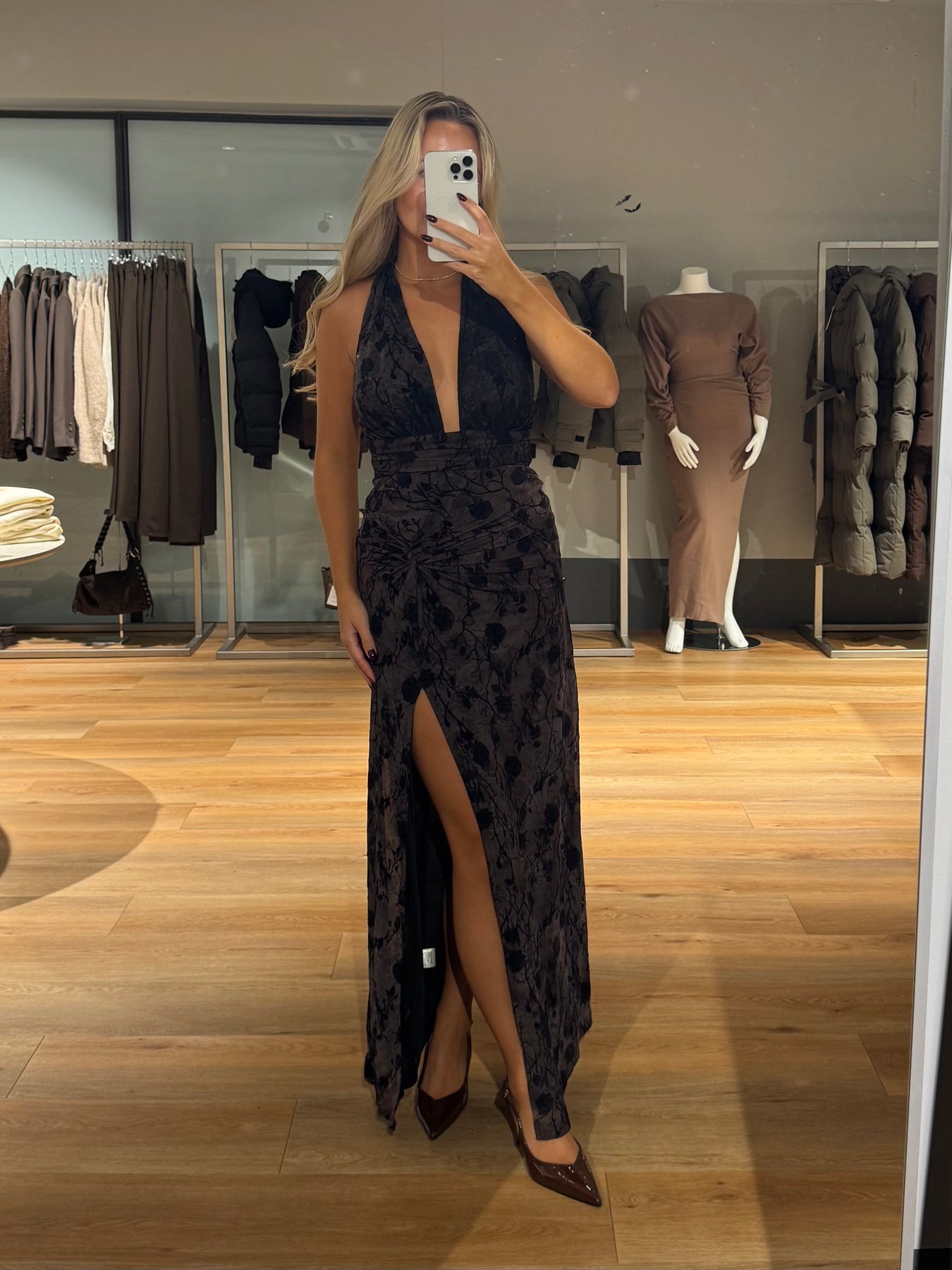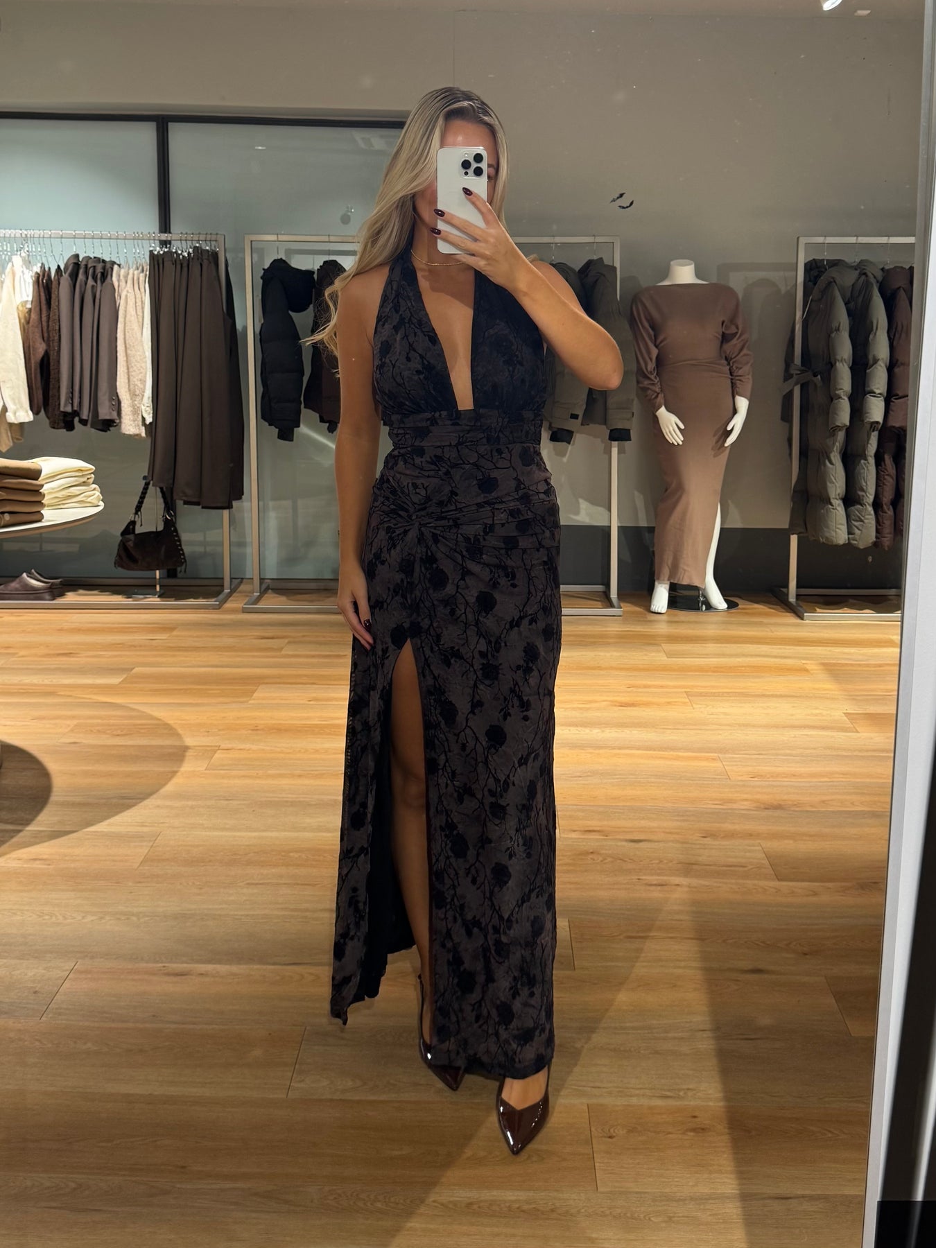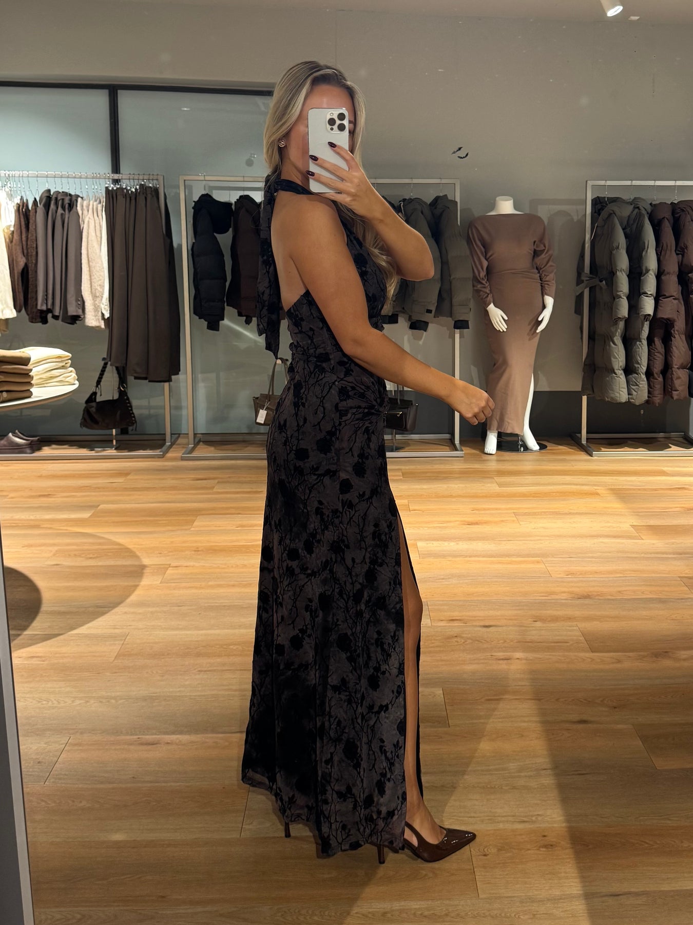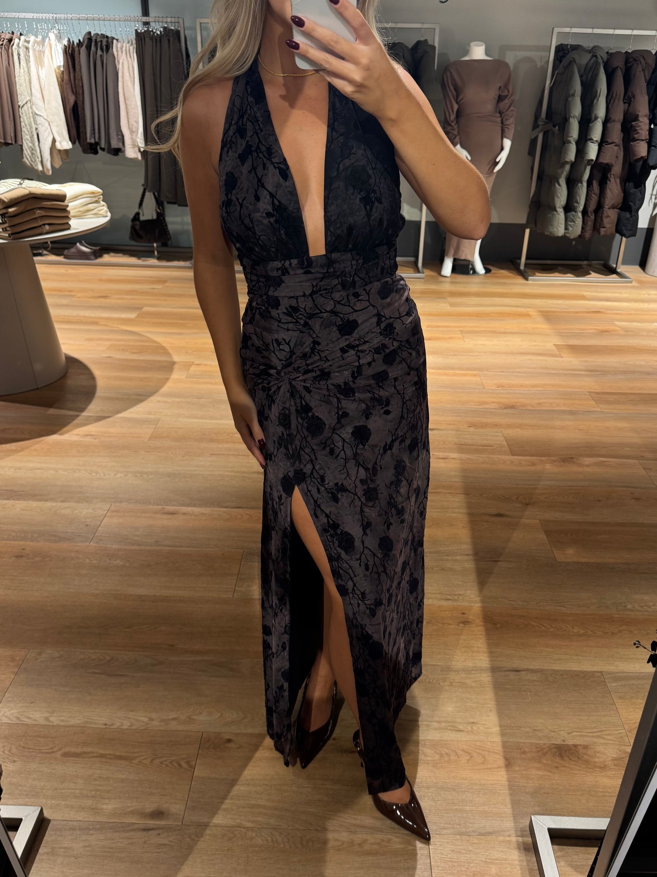 Vanessa kjolen har de smukkeste blomster i stoffet og går ind i taljen. Kjolen bindes i nakken og har en åben ryg. Kjolen er helt perfekt til fine begivenheder og til nytår.