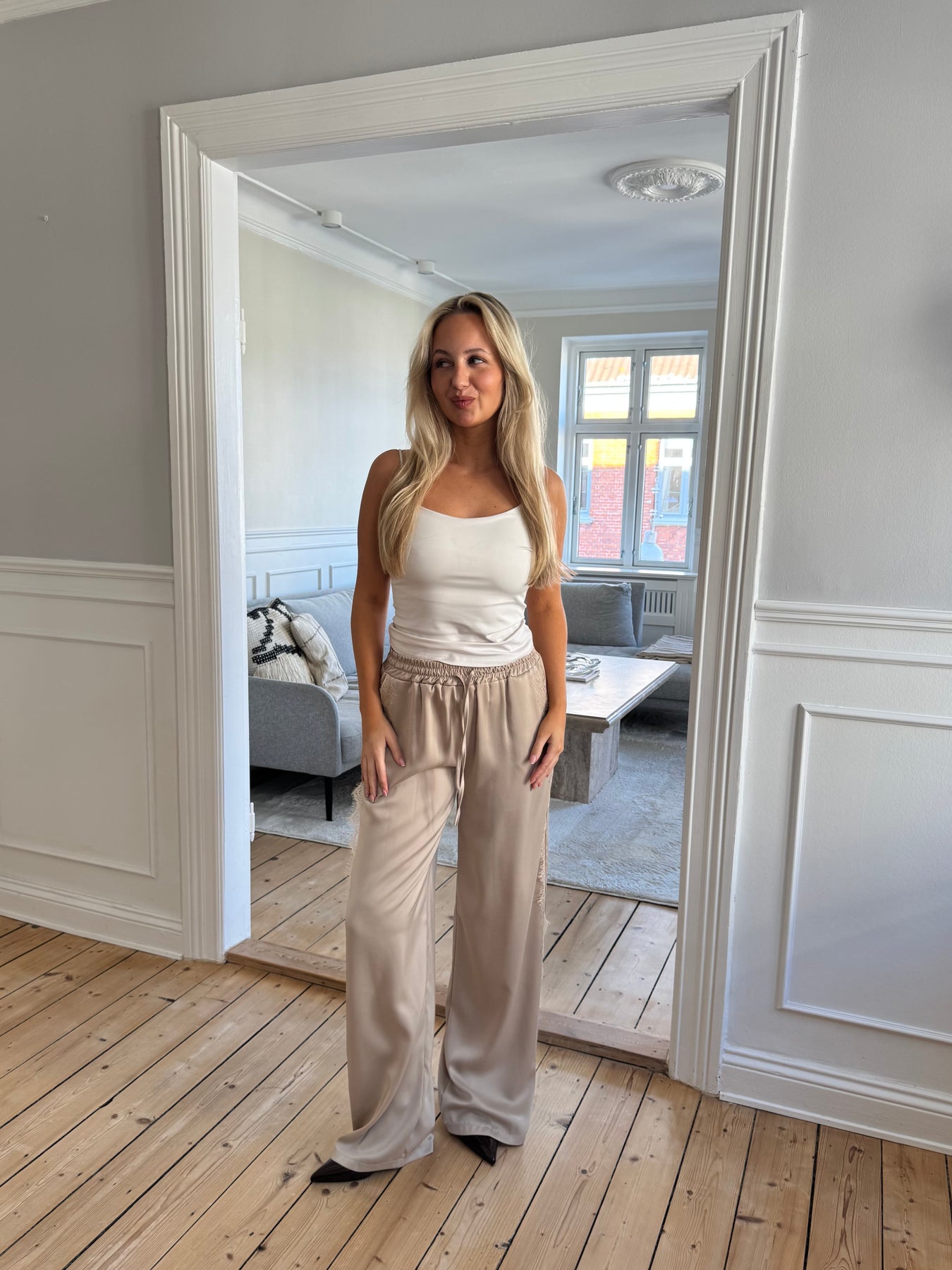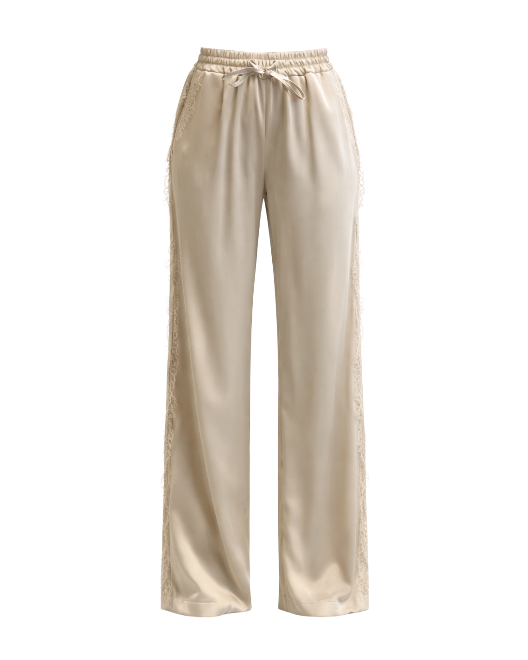 De subtila spetspanelerna längs utsidan av benen ger en sofistikerad touch och gör byxorna perfekta för både vardagsbruk och festligare tillfällen. Det lätta och mjuka materialet ger ett vackert fall och gör dem idealiska att styla med sneakers, sandaler eller klackar.