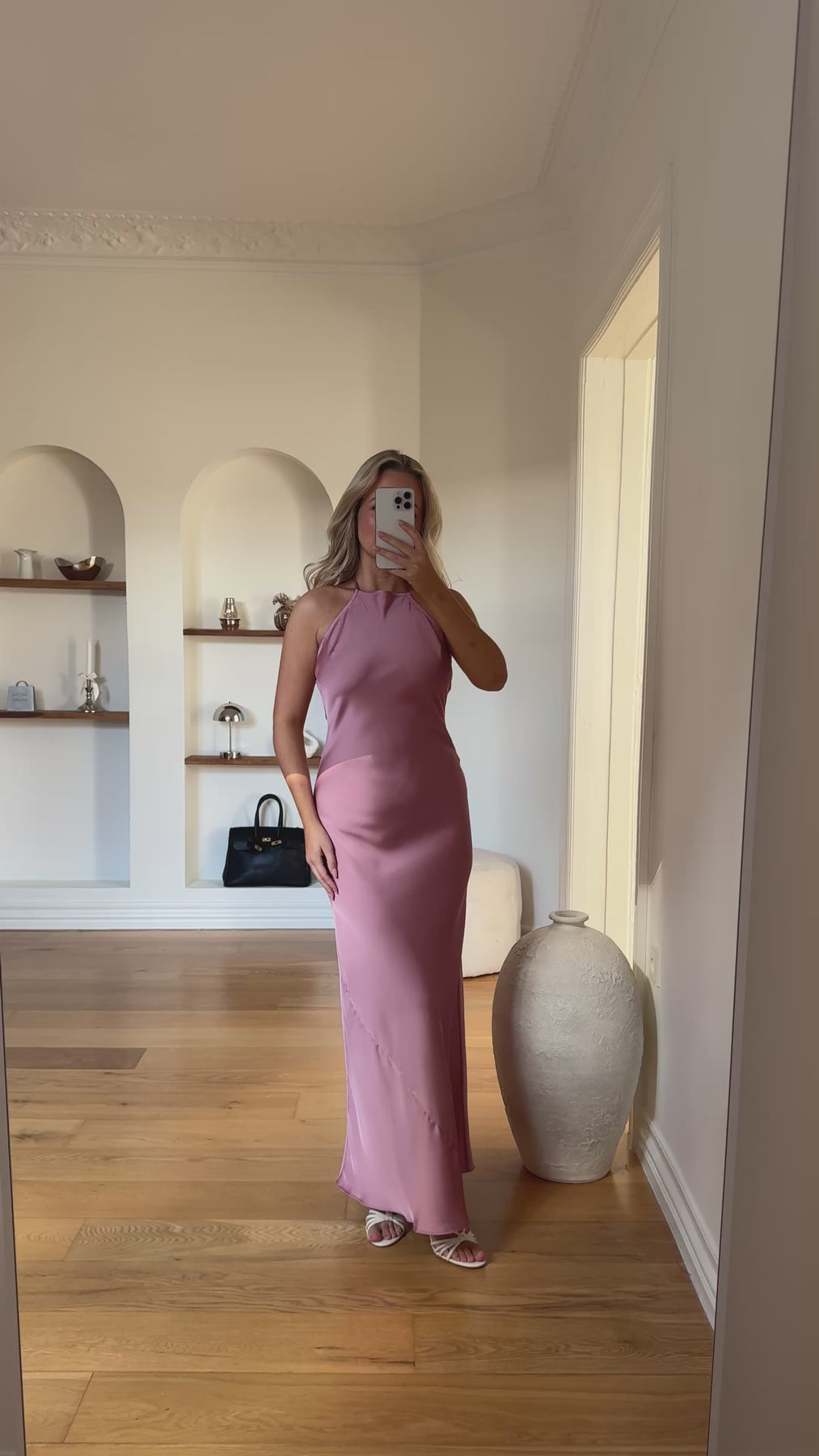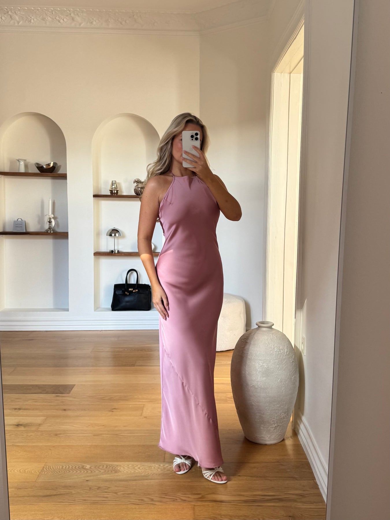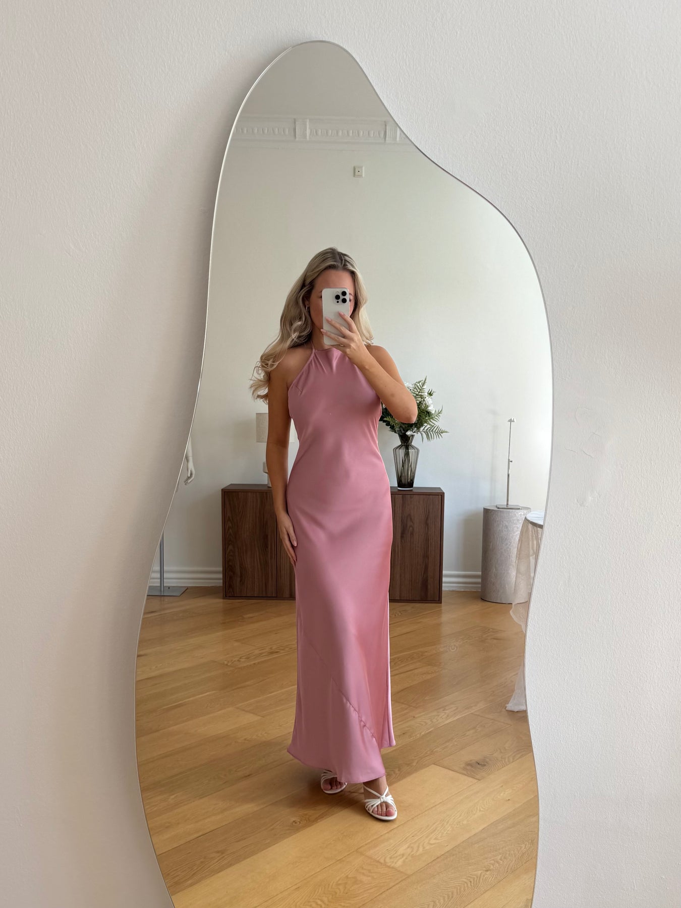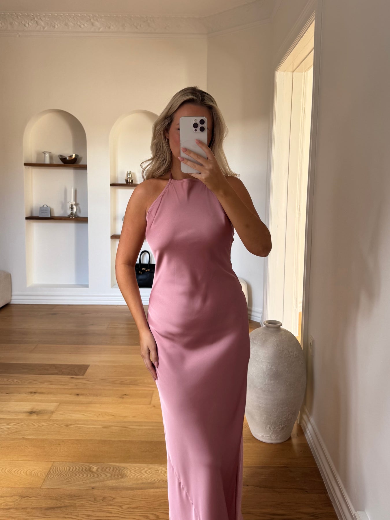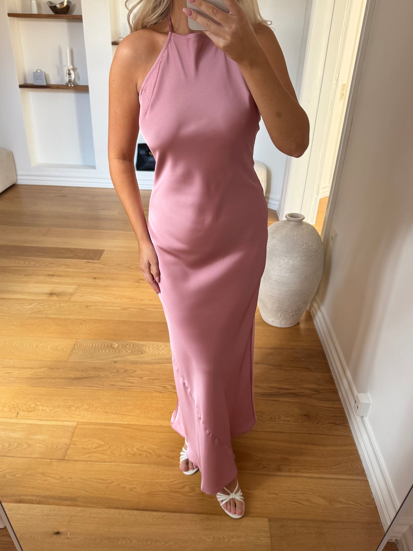 Amina er en elegant og feminin kjole med en smuk, flydende silhuet, der falder let langs kroppen og skaber et sofistikeret udtryk. Det enkle design med halterneck-udskæring fremhæver skuldre og hals på en elegant måde, mens det glatte materiale giver kjolen et eksklusivt og tidløst look. En kjole, der både føles luksuriøs og behagelig at have på.