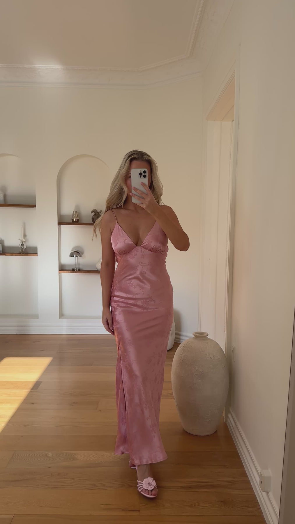 Den dybe V-udskæring og de fine, tynde stropper fremhæver overkroppen elegant, mens den figursyede silhuet falder let og flatterende langs kroppen. Den høje slids foran tilfører bevægelse og et subtilt, sensuelt touch – perfekt til særlige anledninger.
