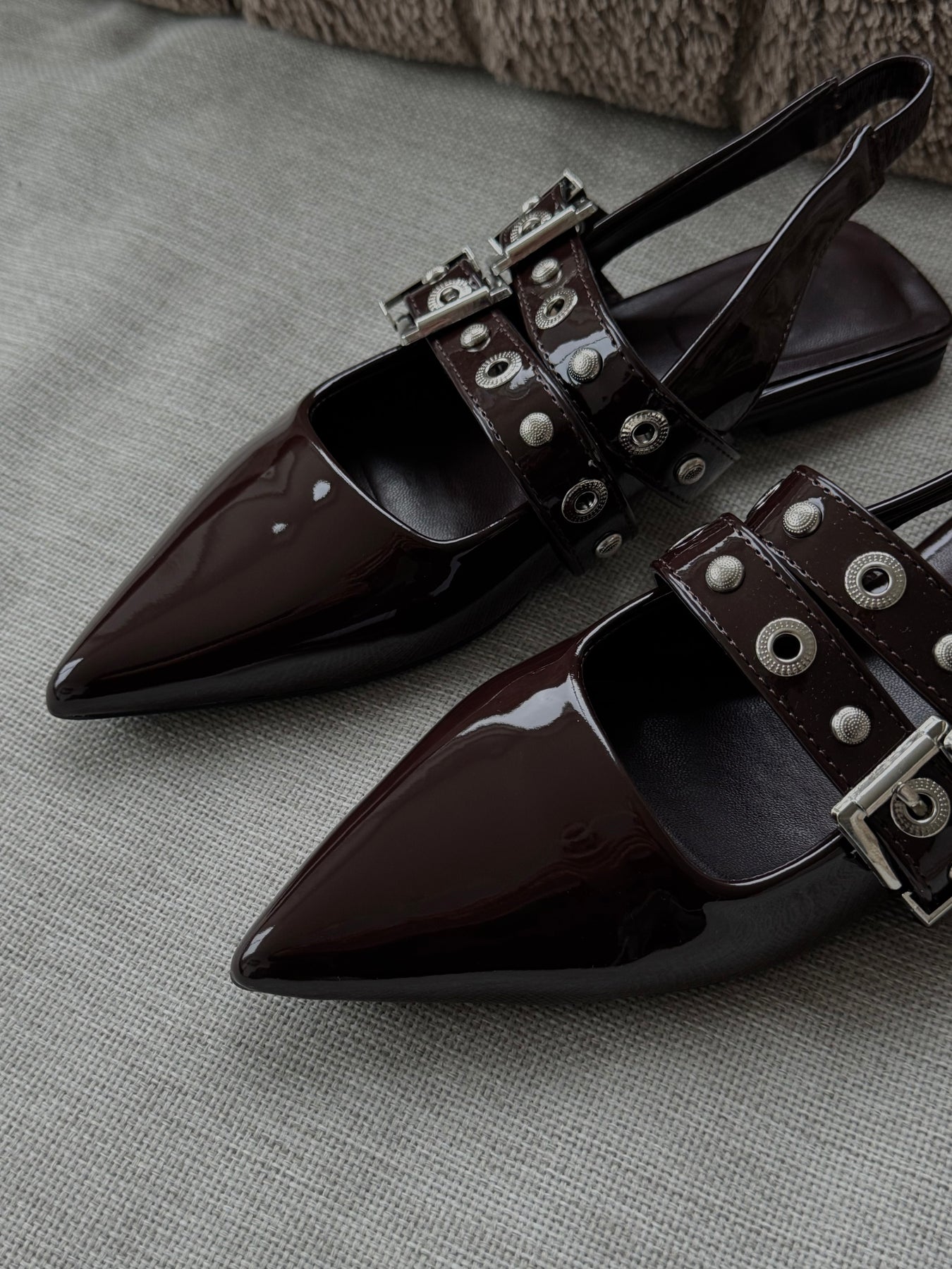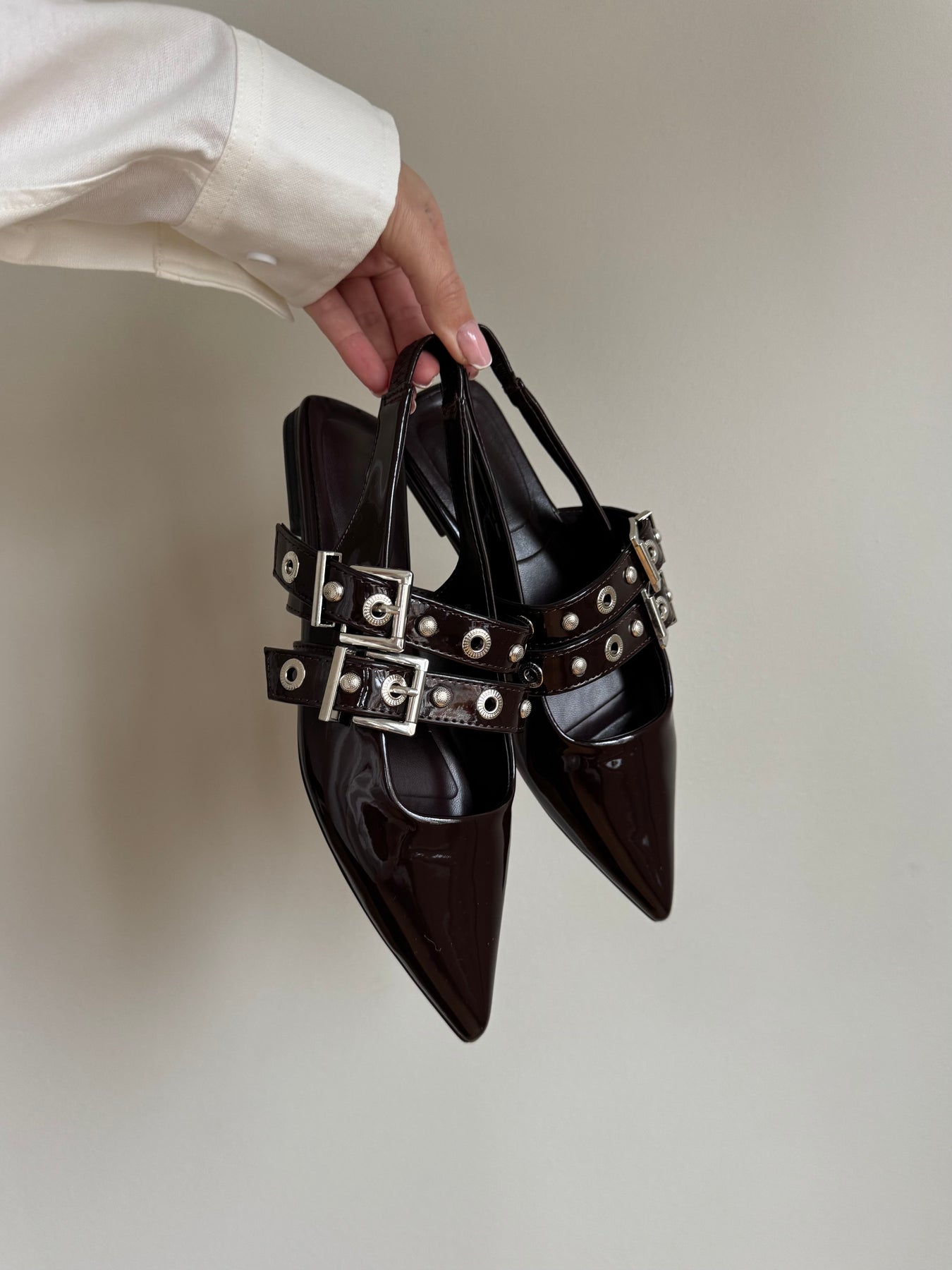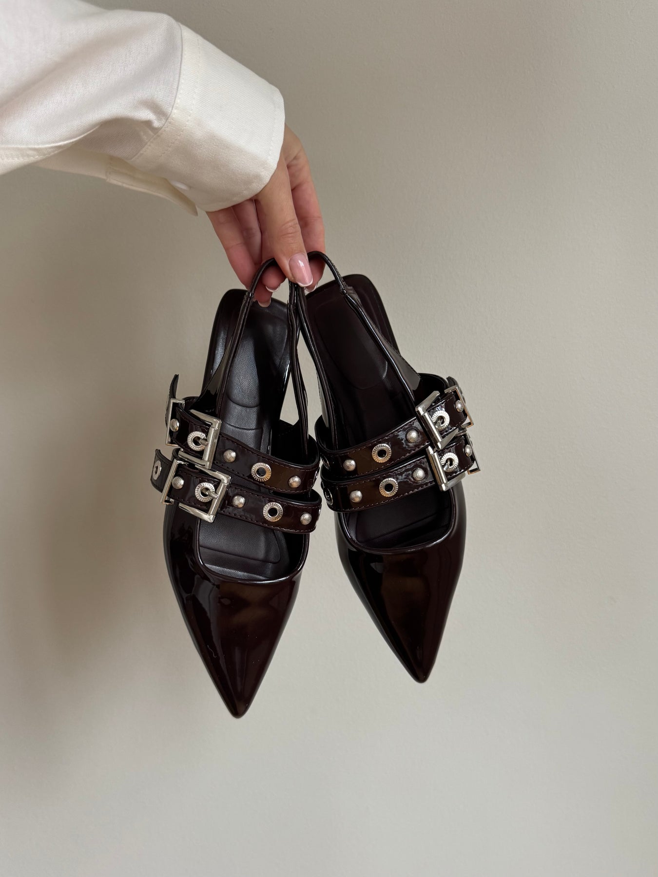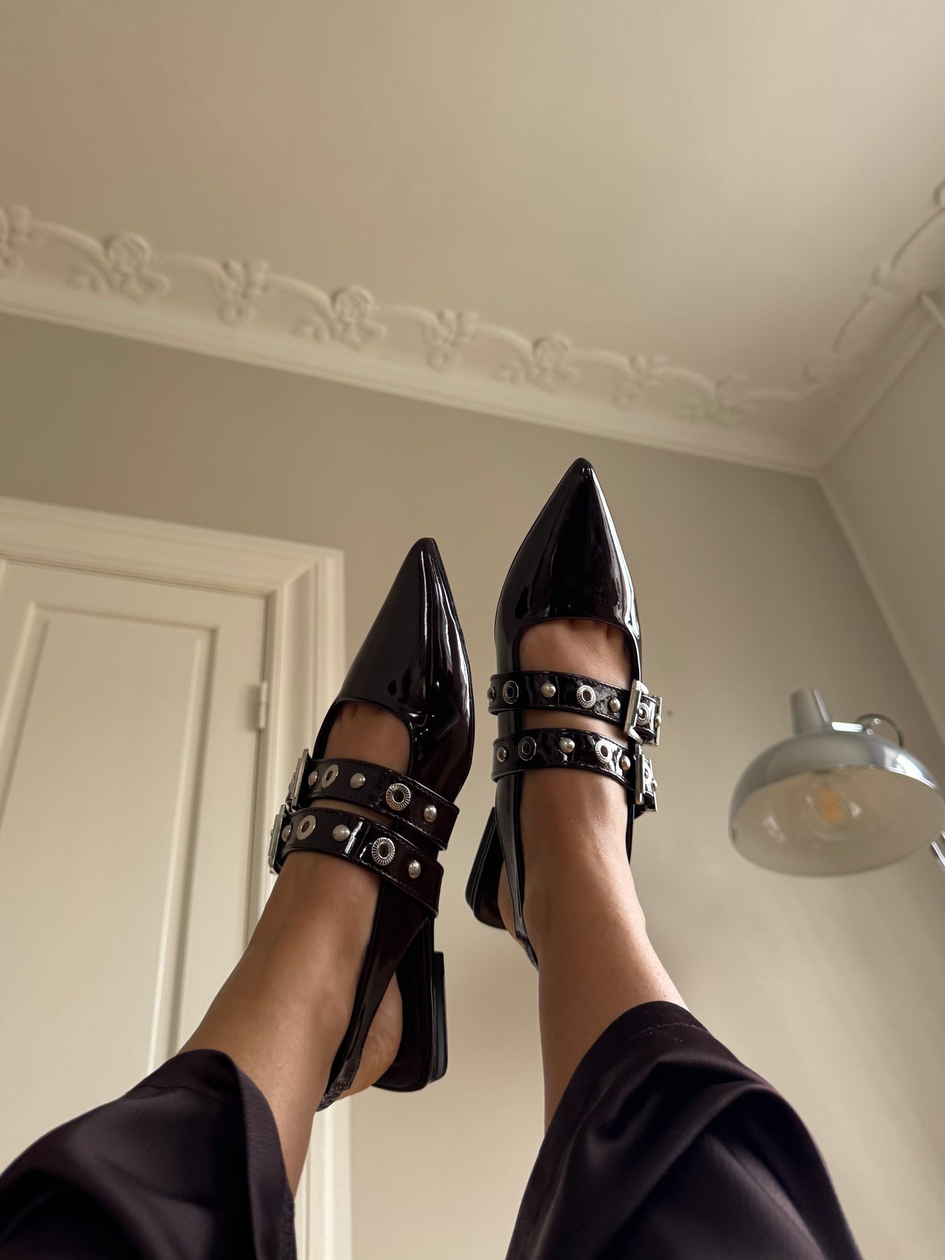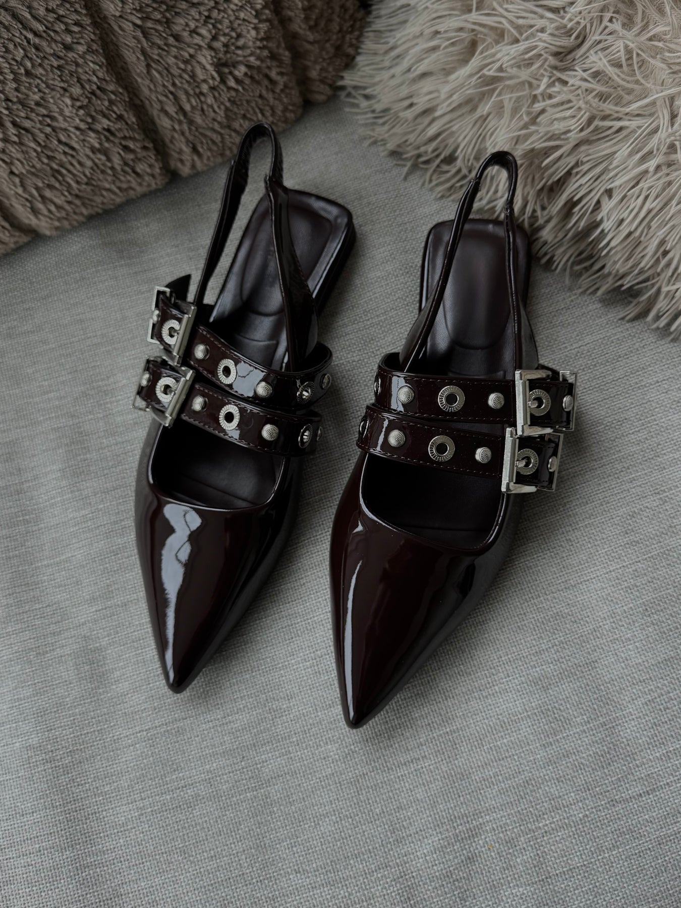 Isabella är iögonfallande slingback-skor med ett modernt och elegant utseende. Den spetsiga tån och den glansiga lackytan ger ett elegant utseende, medan de dekorativa spännena ger kant och karaktär.