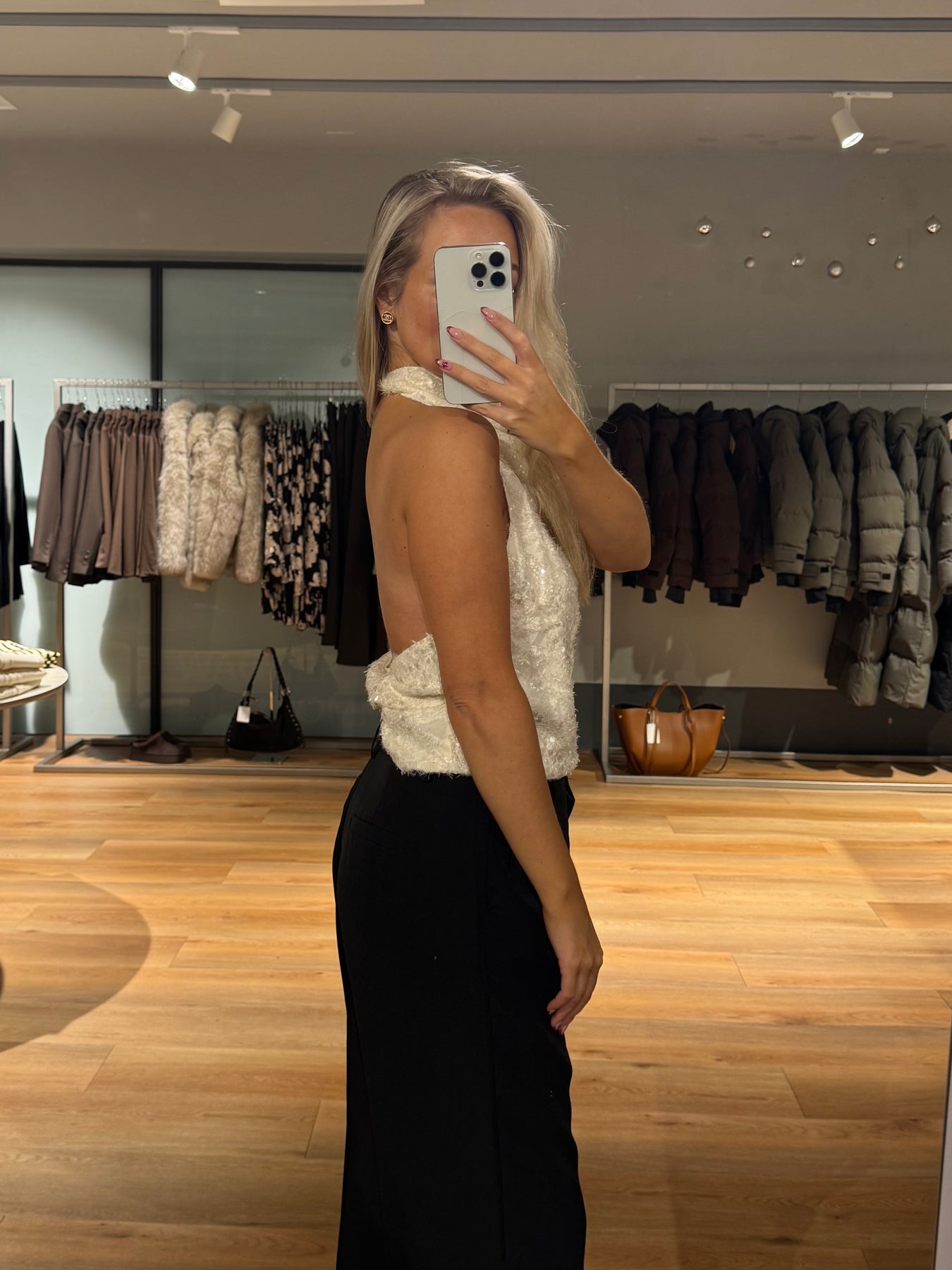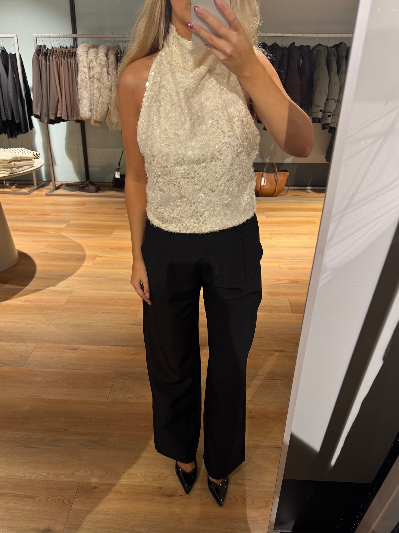 Laura-toppen stängs i halsen och har de vackraste paljetterna. Toppen är perfekt för årets sista fester.