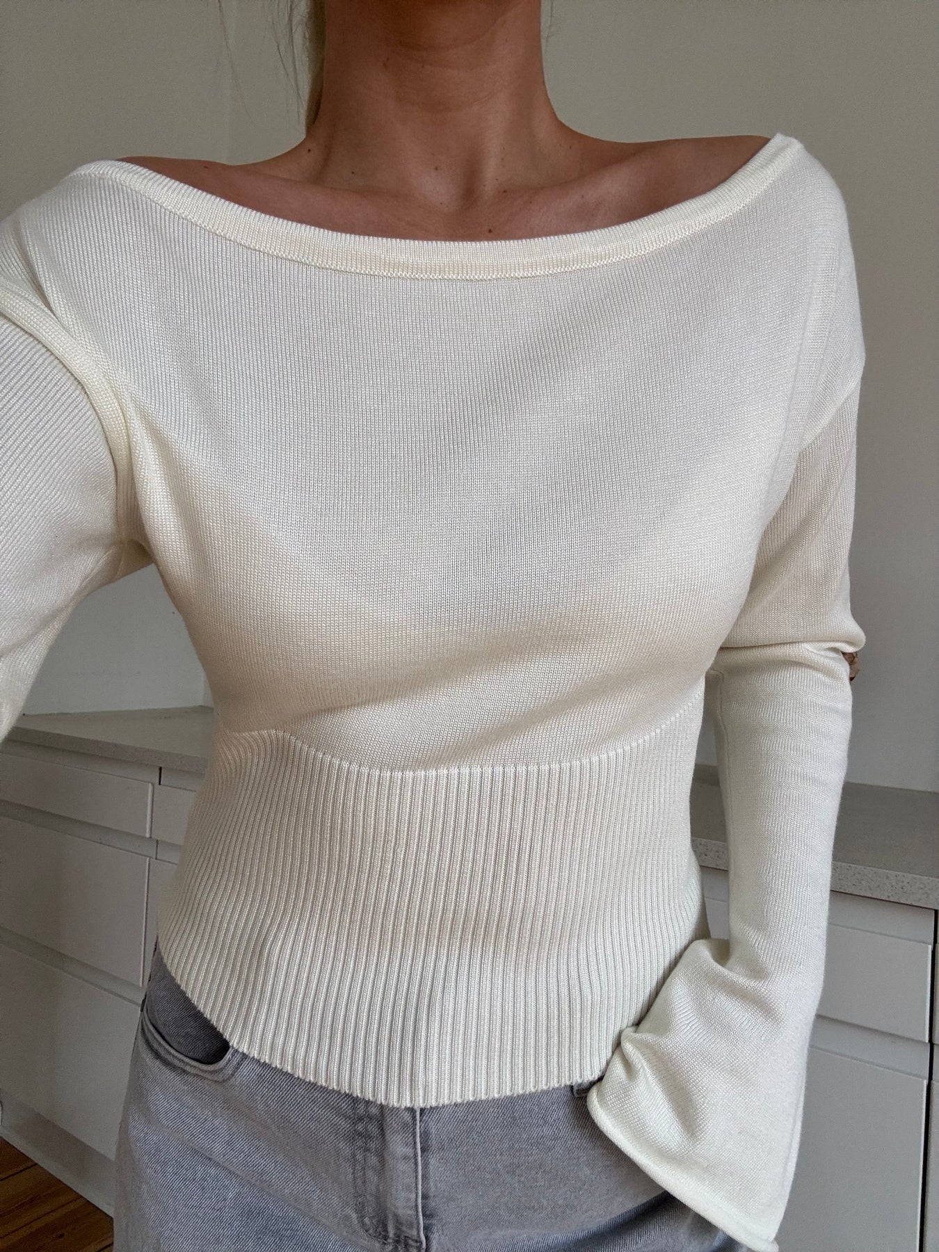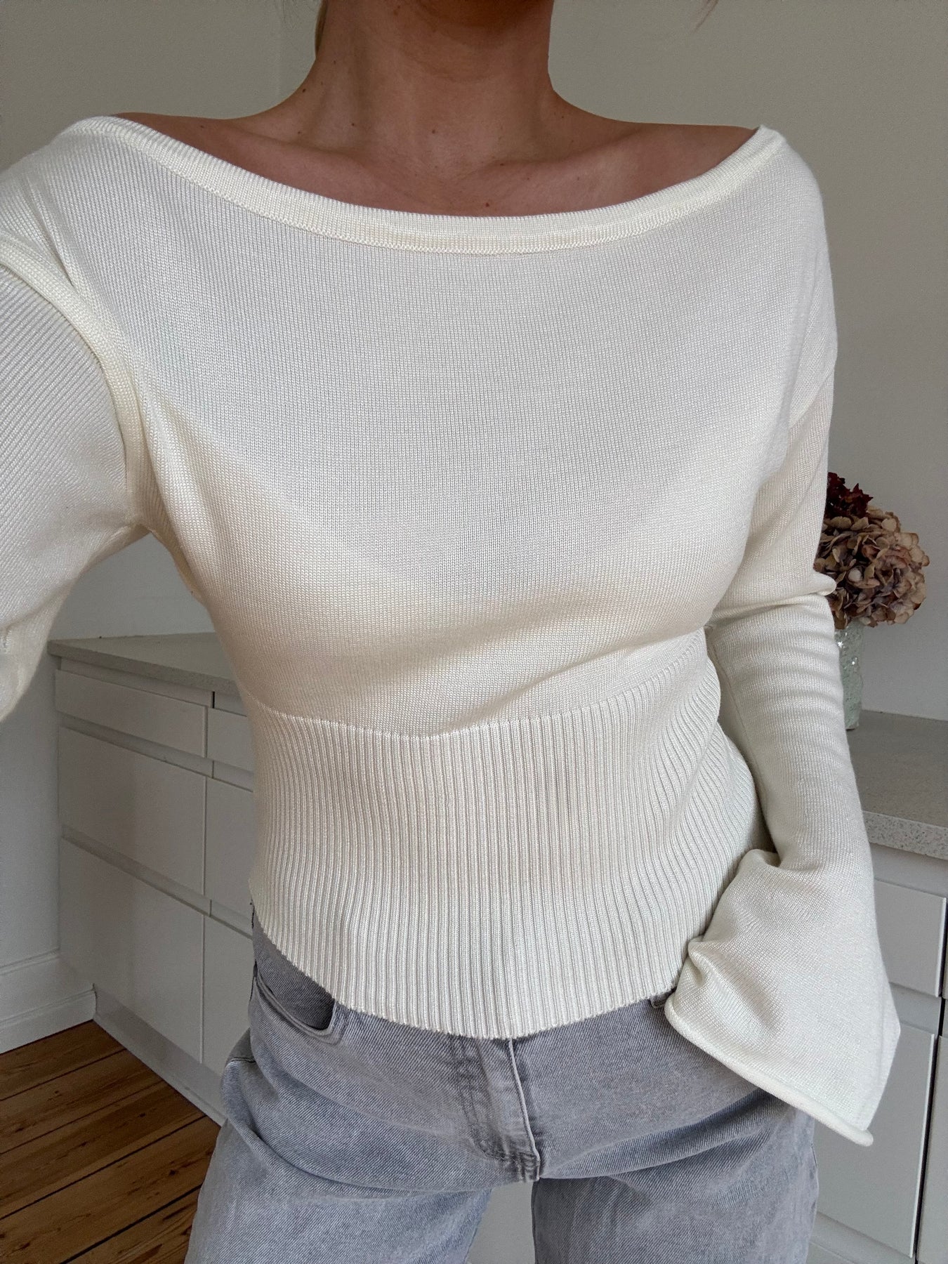 Leonora är en vit stickad blus med en elegant off-shoulder-look som ger en modern och feminin look. Den figurnära skärningen med ribbad midja framhäver silhuetten vackert, medan de långa, lätt utsvängda ärmarna ger en exklusiv och sofistikerad touch.