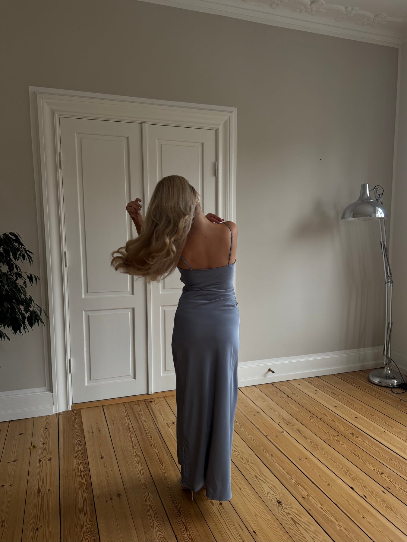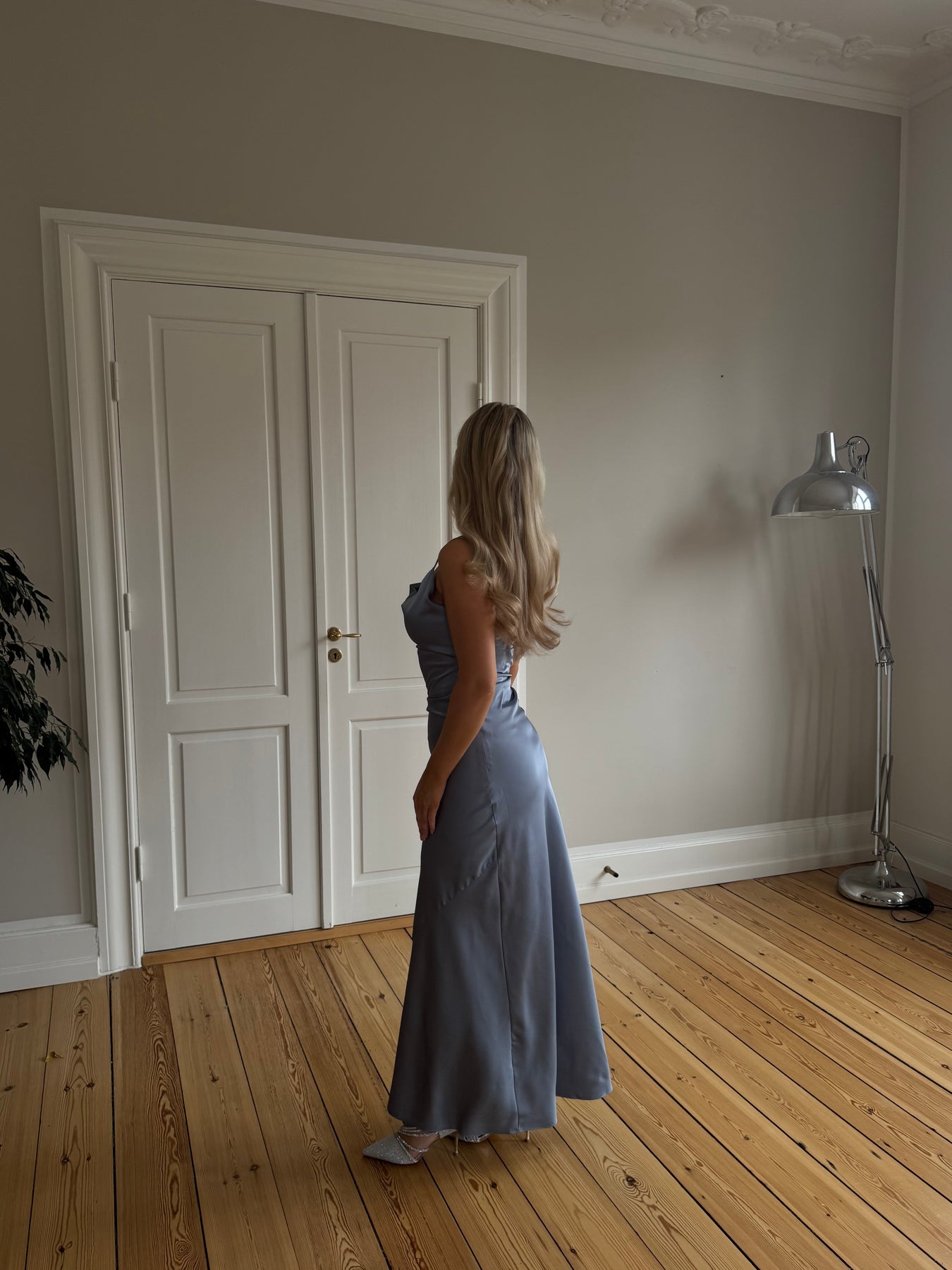 Mathilde är en elegant och feminin klänning med ett exklusivt, lätt glansigt uttryck. Den sitter vackert runt kroppen och framhäver silhuetten på ett sofistikerat sätt, medan tygets fina fall ger ett mjukt och lyxigt utseende.