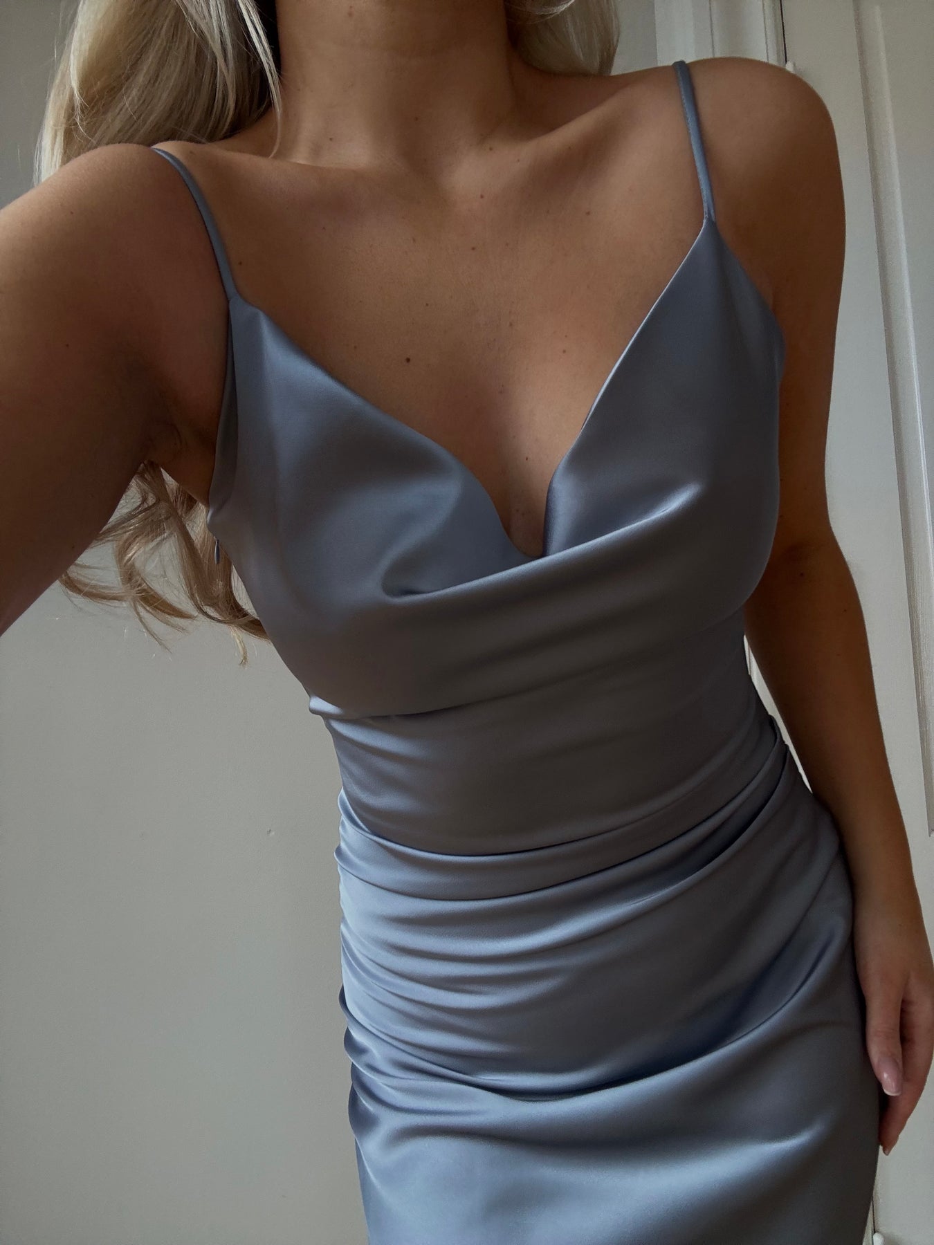 De tunna banden och den smickrande halsringningen skapar en lätt och feminin look, vilket gör klänningen perfekt för speciella tillfällen, sommarfester eller kvällar där du vill känna dig extra elegant.