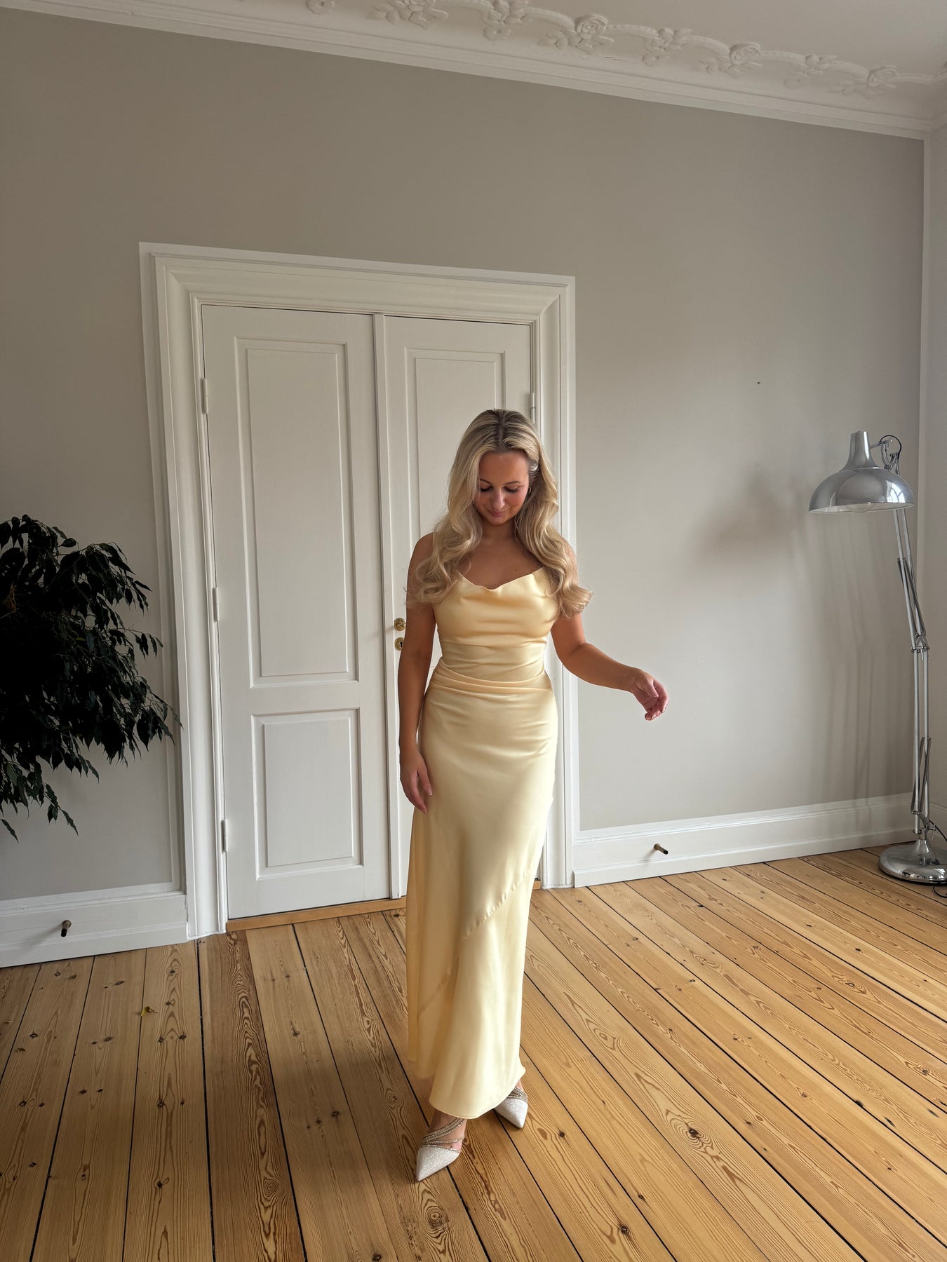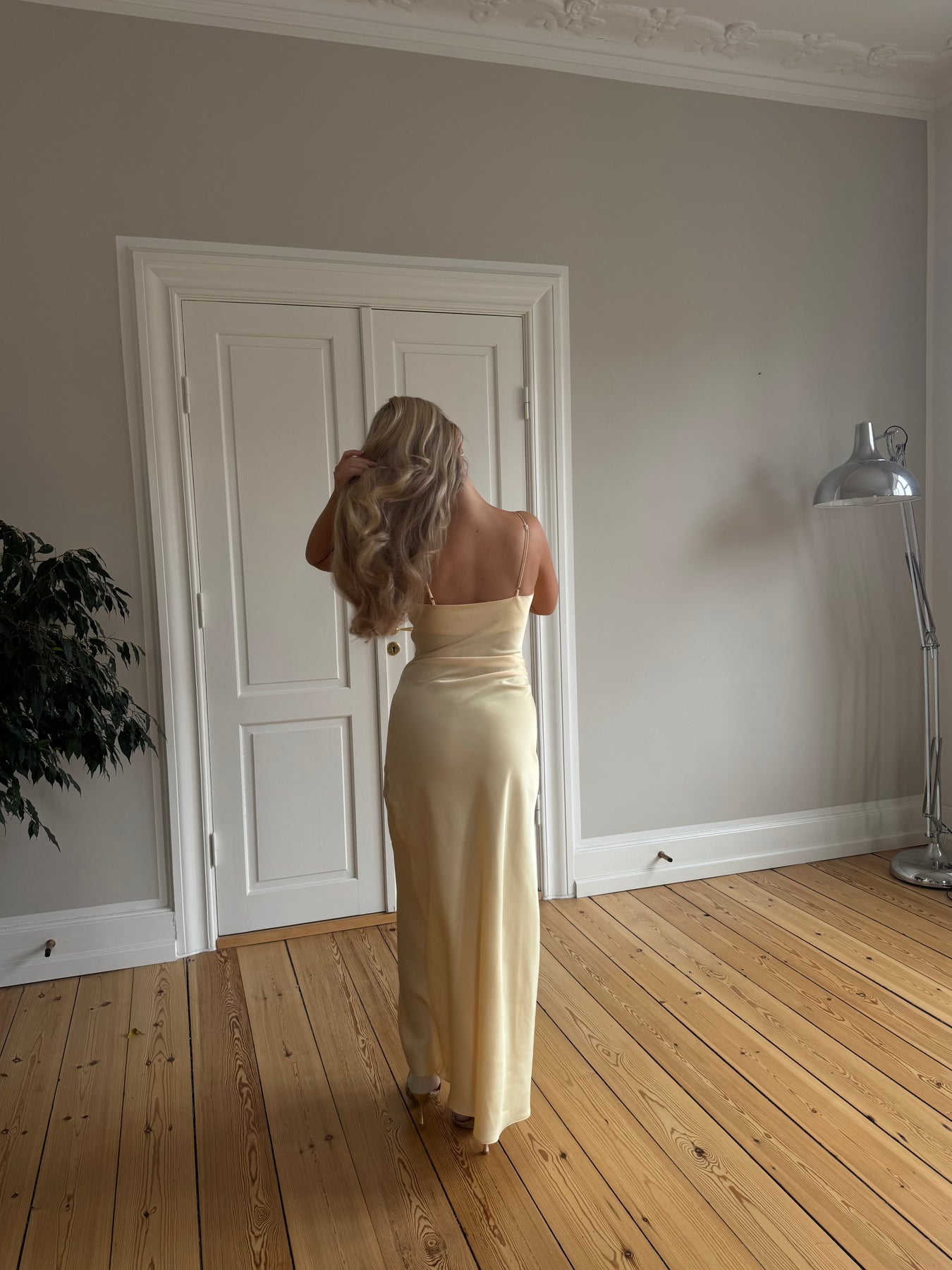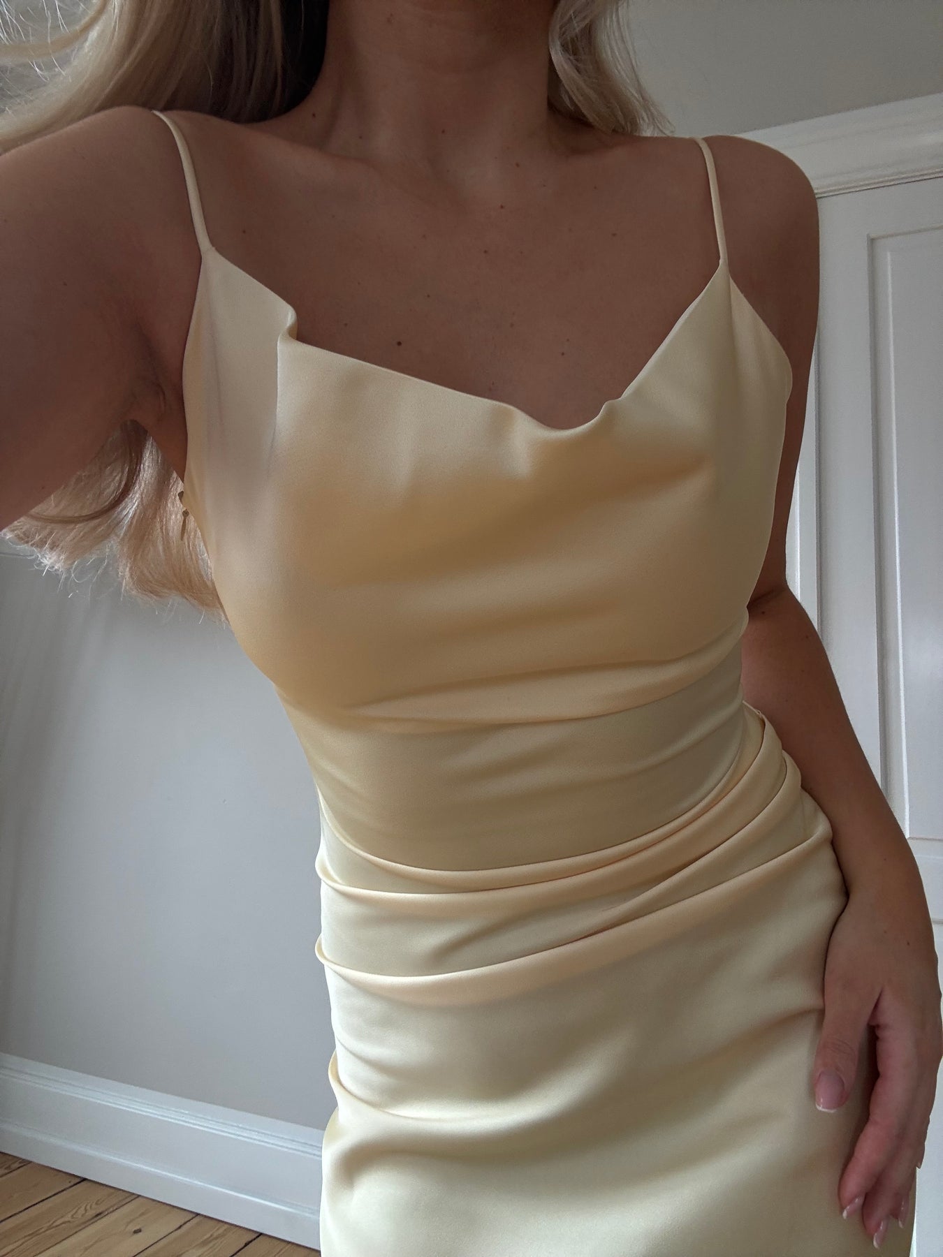 Mathilde är en elegant och feminin klänning med ett exklusivt, lätt glansigt uttryck. Den sitter vackert runt kroppen och framhäver silhuetten på ett sofistikerat sätt, medan tygets fina fall ger ett mjukt och lyxigt utseende.