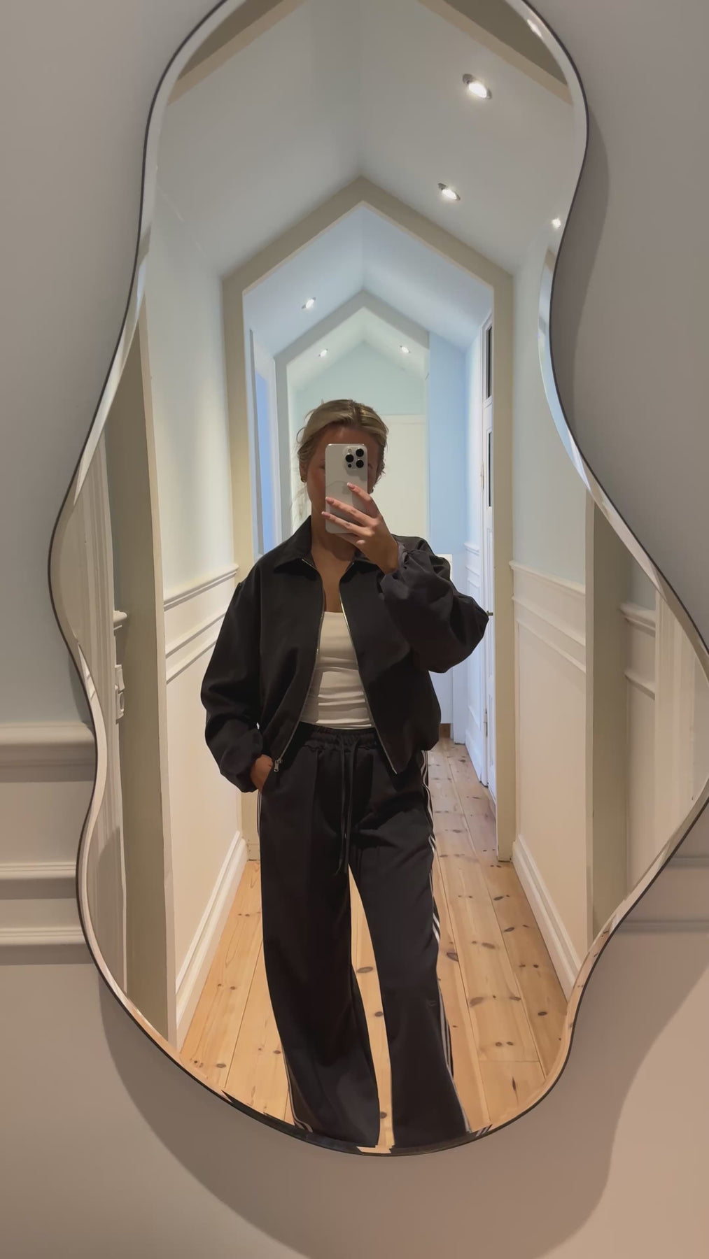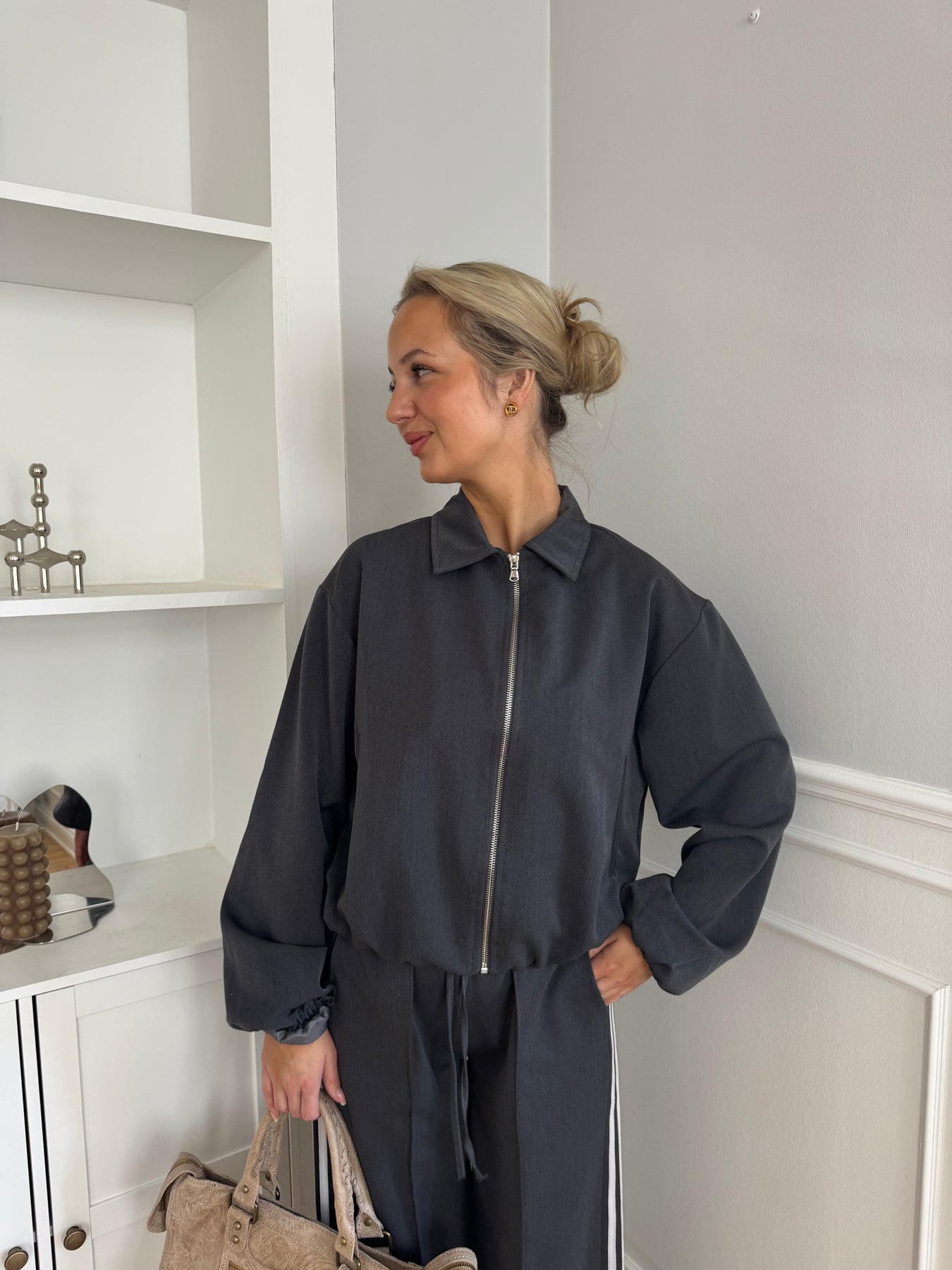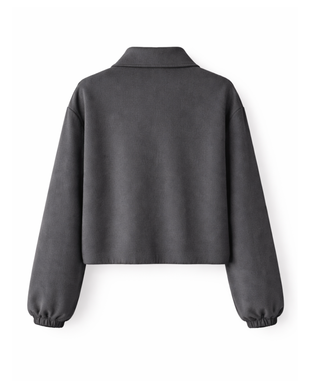 Den har en klassisk krage, hel dragkedja och diskreta sidfickor, vilket kombinerar funktionalitet med ett rent utseende. De lätt voluminösa ärmarna med resår vid handlederna ger jackan ett modernt snitt, medan den korta längden skapar en fin och balanserad silhuett.